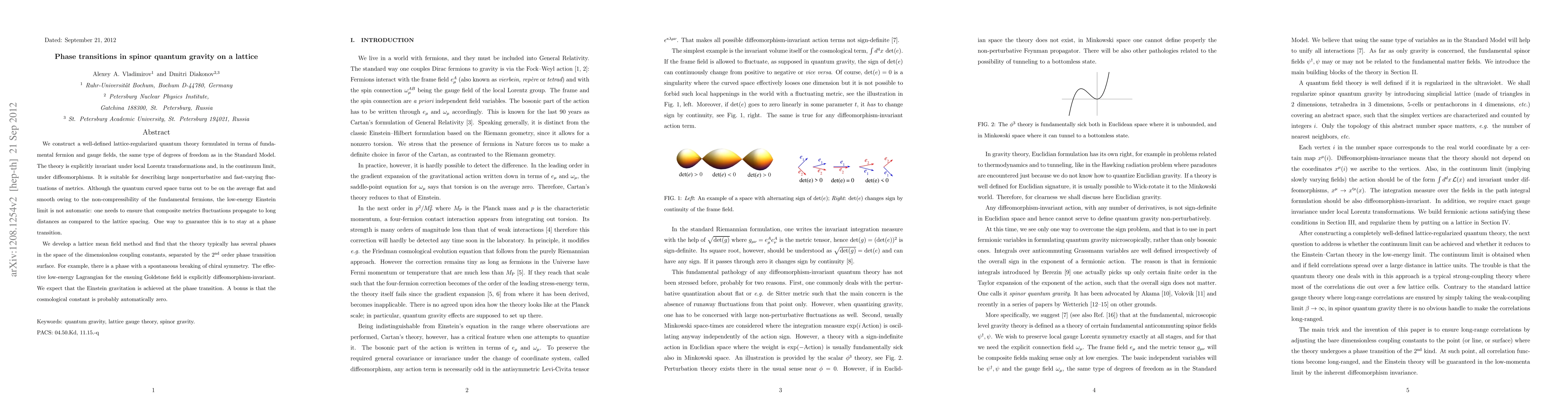 We construct a well-defined lattice-regularized quantum theory formulated in terms of fundamental fermion and gauge fields, the same type of degrees of freedom as in the Standard Model. The theory is explicitly invariant under local Lorentz transformations and, in the continuum limit, under diffeomorphisms. It is suitable for describing large nonperturbative and fast-varying fluctuations of metrics. Although the quantum curved space turns out to be on the average flat and smooth owing to the non-compressibility of the fundamental fermions, the low-energy Einstein limit is not automatic: one needs to ensure that composite metrics fluctuations propagate to long distances as compared to the lattice spacing. One way to guarantee this is to stay at a phase transition. We develop a lattice mean field method and find that the theory typically has several phases in the space of the dimensionless coupling constants, separated by the second order phase transition surface. For example, there is a phase with a spontaneous breaking of chiral symmetry. The effective low-energy Lagrangian for the ensuing Goldstone field is explicitly diffeomorphism-invariant. We expect that the Einstein gravitation is achieved at the phase transition. A bonus is that the cosmological constant is probably automatically zero.