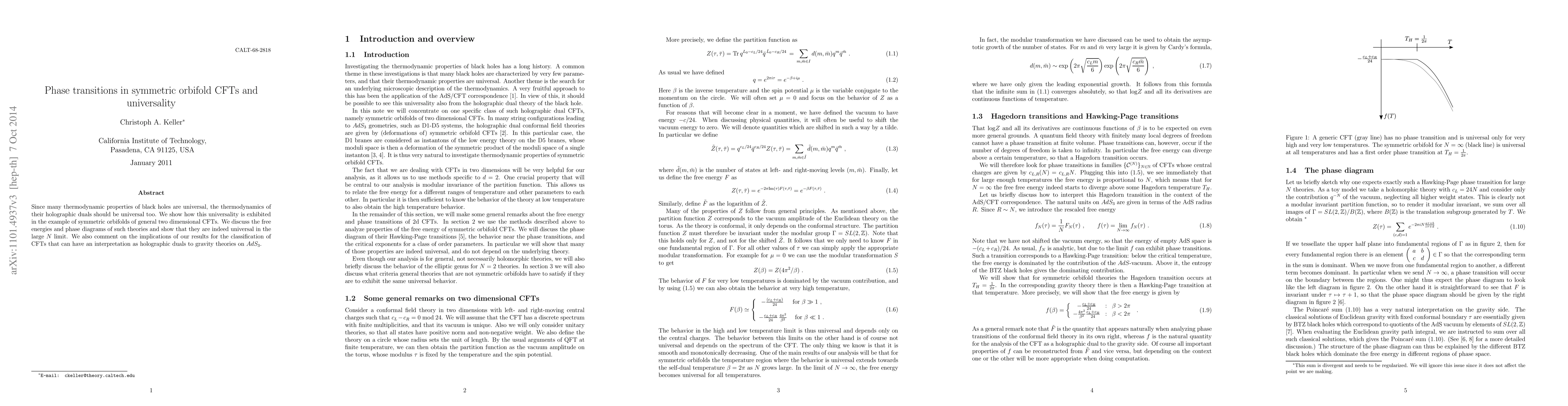 Since many thermodynamic properties of black holes are universal, the thermodynamics of their holographic duals should be universal too. We show how this universality is exhibited in the example of symmetric orbifolds of general two dimensional CFTs. We discuss the free energies and phase diagrams of such theories and show that they are indeed universal in the large N limit. We also comment on the implications of our results for the classification of CFTs that can have an interpretation as holographic duals to gravity theories on AdS(3).