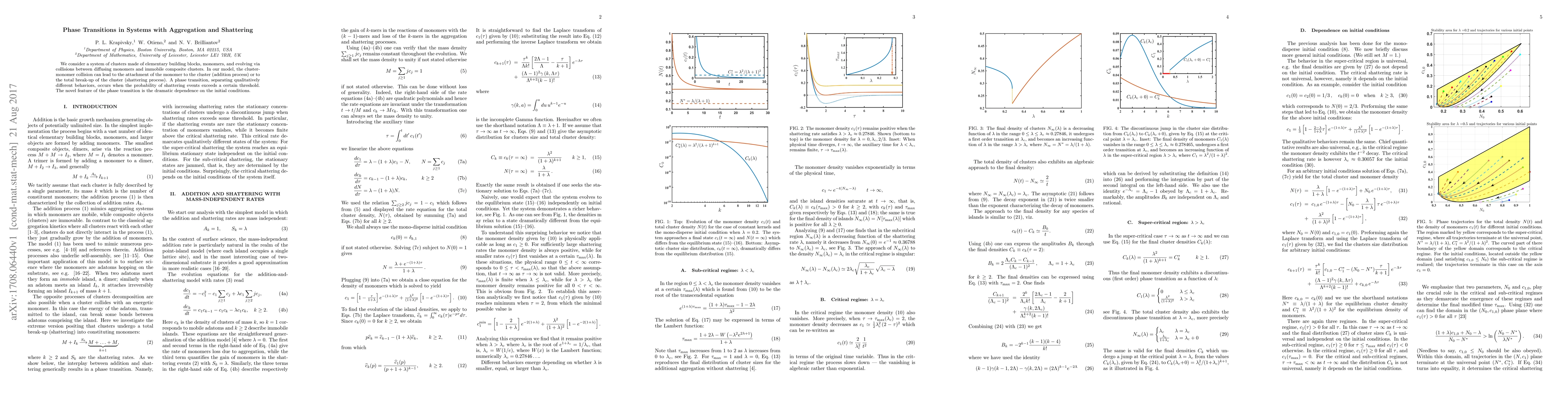 This paper investigates a system where clusters form through monomer collisions, with both attachment and shattering processes. A phase transition occurs when the shattering probability surpasses a threshold, characterized by a strong dependence on initial conditions.
