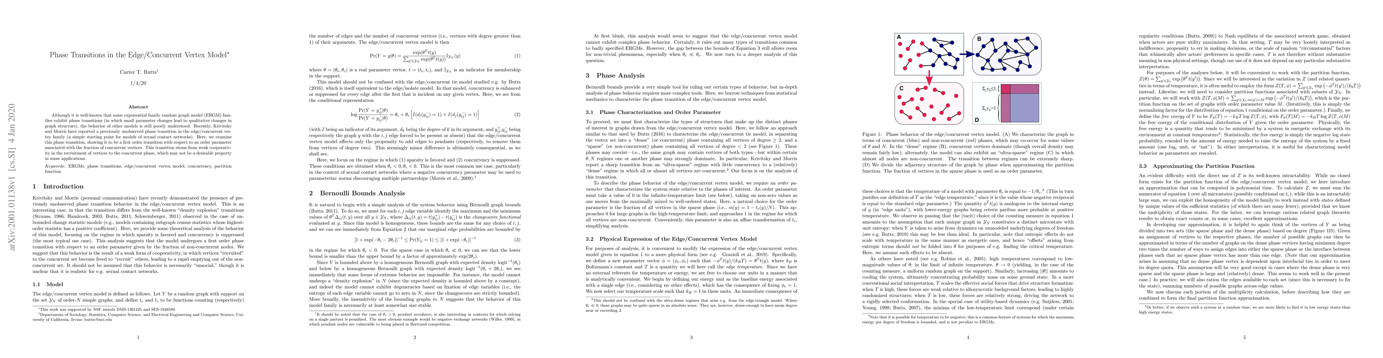 Although it is well-known that some exponential family random graph model (ERGM) families exhibit phase transitions (in which small parameter changes lead to qualitative changes in graph structure), the behavior of other models is still poorly understood. Recently, Krivitsky and Morris have reported a previously unobserved phase transition in the edge/concurrent vertex family (a simple starting point for models of sexual contact networks). Here, we examine this phase transition, showing it to be a first order transition with respect to an order parameter associated with the fraction of concurrent vertices. This transition stems from weak cooperativity in the recruitment of vertices to the concurrent phase, which may not be a desirable property in some applications.