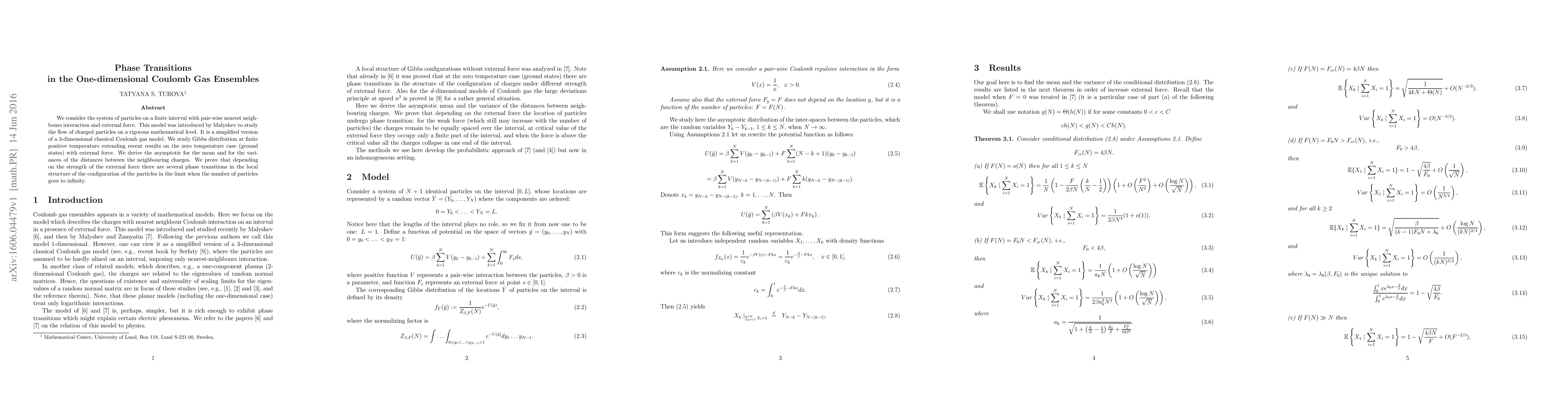 We consider the system of particles on a finite interval with pair-wise nearest neighbours interaction and external force. This model was introduced by Malyshev to study the flow of charged particles on a rigorous mathematical level. It is a simplified version of a 3-dimensional classical Coulomb gas model. We study Gibbs distribution at finite positive temperature extending recent results on the zero temperature case (ground states) with external force. We derive the asymptotic for the mean and for the variances of the distances between the neighbouring charges. We prove that depending on the strength of the external force there are several phase transitions in the local structure of the configuration of the particles in the limit when the number of particles goes to infinity.