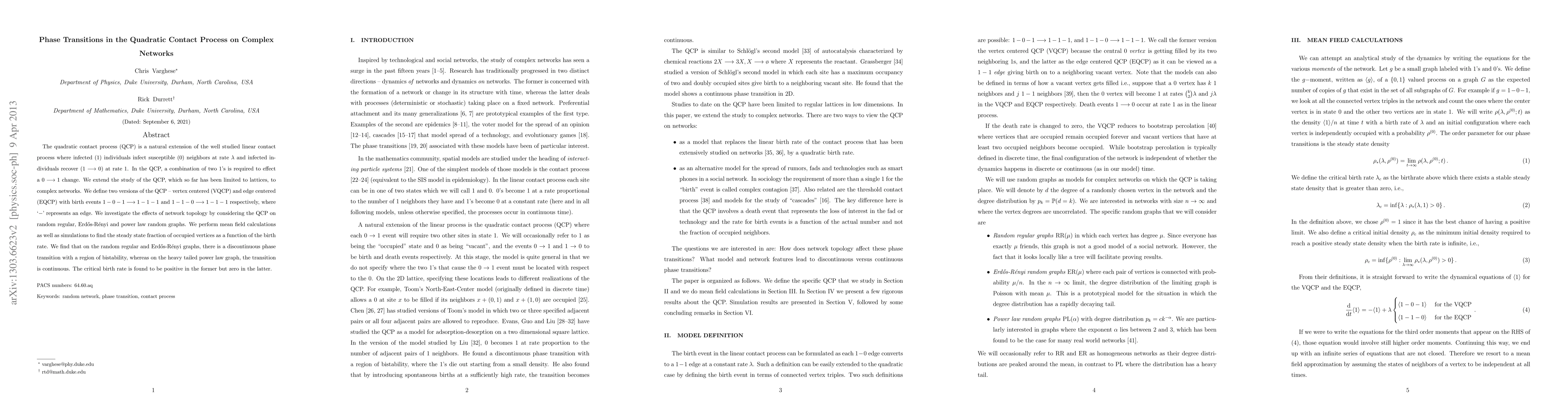 The quadratic contact process (QCP) is a natural extension of the well studied linear contact process where infected (1) individuals infect susceptible (0) neighbors at rate $\lambda$ and infected individuals recover ($1 \longrightarrow 0$) at rate 1. In the QCP, a combination of two 1's is required to effect a $0 \longrightarrow 1$ change. We extend the study of the QCP, which so far has been limited to lattices, to complex networks. \comment{as a model for the change in a population through sexual reproduction and death.} We define two versions of the QCP -- vertex centered (VQCP) and edge centered (EQCP) with birth events $1-0-1 \longrightarrow 1-1-1$ and $1-1-0 \longrightarrow 1-1-1$ respectively, where `$-$' represents an edge. We investigate the effects of network topology by considering the QCP on random regular, Erd\H{o}s-R\'{e}nyi and power law random graphs. We perform mean field calculations as well as simulations to find the steady state fraction of occupied vertices as a function of the birth rate. We find that on the random regular and Erd\H{o}s-R\'{e}nyi graphs, there is a discontinuous phase transition with a region of bistability, whereas on the heavy tailed power law graph, the transition is continuous. The critical birth rate is found to be positive in the former but zero in the latter.