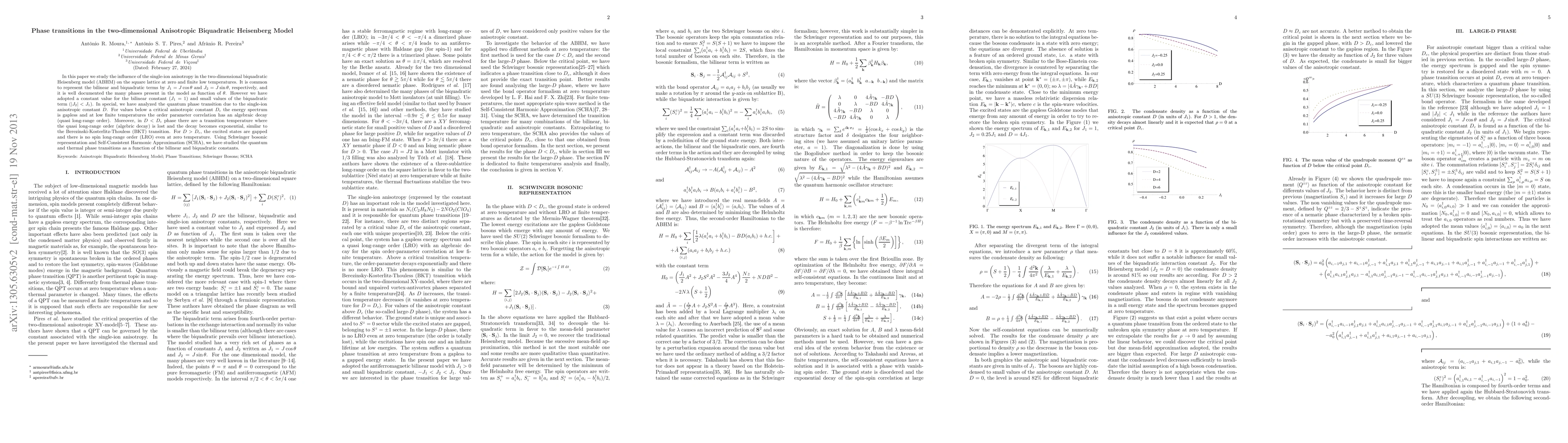 This paper investigates the phase transitions in the two-dimensional Anisotropic Biquadratic Heisenberg Model (ABHM) on a square lattice, focusing on the influence of single-ion anisotropy. It reveals a quantum phase transition driven by the anisotropic constant $D$, leading to gapless energy spectrum and quasi long-range order below a critical value $D_c$, and a Berezinski-Kosterlitz-Thouless transition at low finite temperatures.