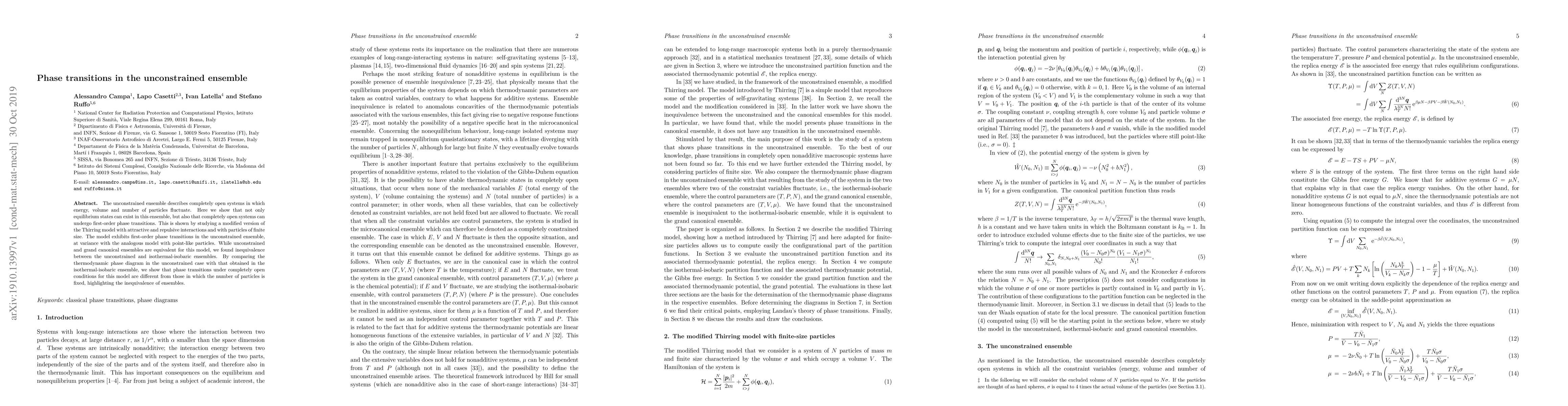 The unconstrained ensemble describes completely open systems in which energy, volume and number of particles fluctuate. Here we show that not only equilibrium states can exist in this ensemble, but also that completely open systems can undergo first-order phase transitions. This is shown by studying a modified version of the Thirring model with attractive and repulsive interactions and with particles of finite size. The model exhibits first-order phase transitions in the unconstrained ensemble, at variance with the analogous model with point-like particles. While unconstrained and grand canonical ensembles are equivalent for this model, we found inequivalence between the unconstrained and isothermal-isobaric ensembles. By comparing the thermodynamic phase diagram in the unconstrained case with that obtained in the isothermal-isobaric ensemble, we show that phase transitions under completely open conditions for this model are different from those in which the number of particles is fixed, highlighting the inequivalence of ensembles.