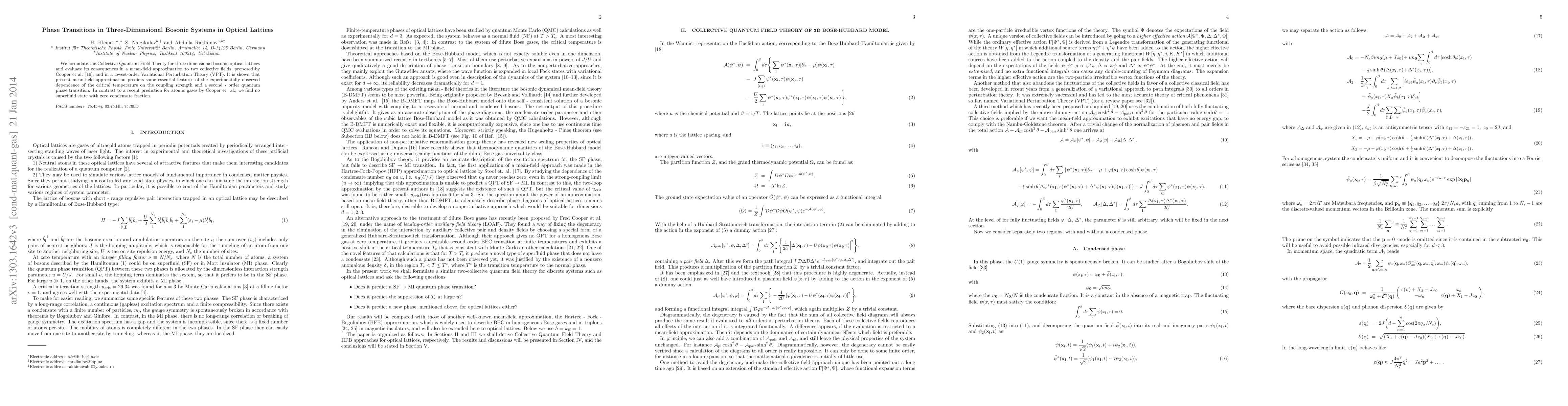 This paper formulates a Collective Quantum Field Theory for three-dimensional bosonic optical lattices and uses mean-field approximations to predict critical temperature dependence and a second-order quantum phase transition. Contrary to previous predictions, the study finds no superfluid state with zero condensate fraction.