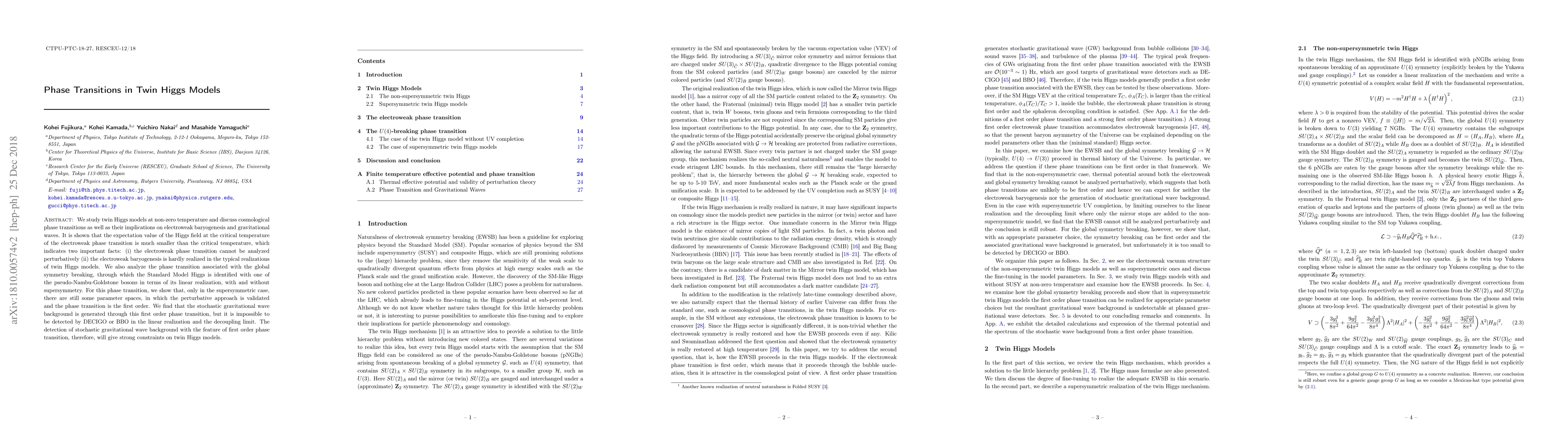 This paper investigates twin Higgs models at non-zero temperature, revealing that the electroweak phase transition is non-perturbative and unlikely to support electroweak baryogenesis. It also finds that only in supersymmetric twin Higgs models can the phase transition associated with global symmetry breaking be first-order and detectable via gravitational waves, though not by current detectors.