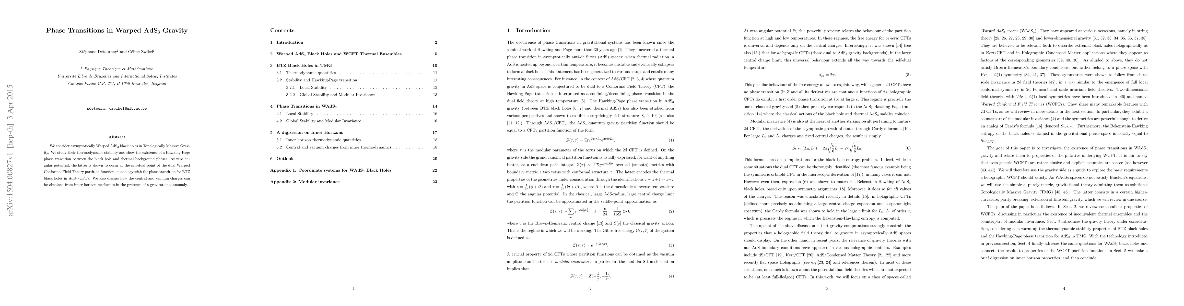 This paper investigates thermodynamic stability in Warped AdS$_3$ black holes within Topologically Massive Gravity, revealing a Hawking-Page phase transition between black hole and thermal phases, analogous to BTZ black holes, and discusses obtaining central and vacuum charges via inner horizon mechanics amidst a gravitational anomaly.