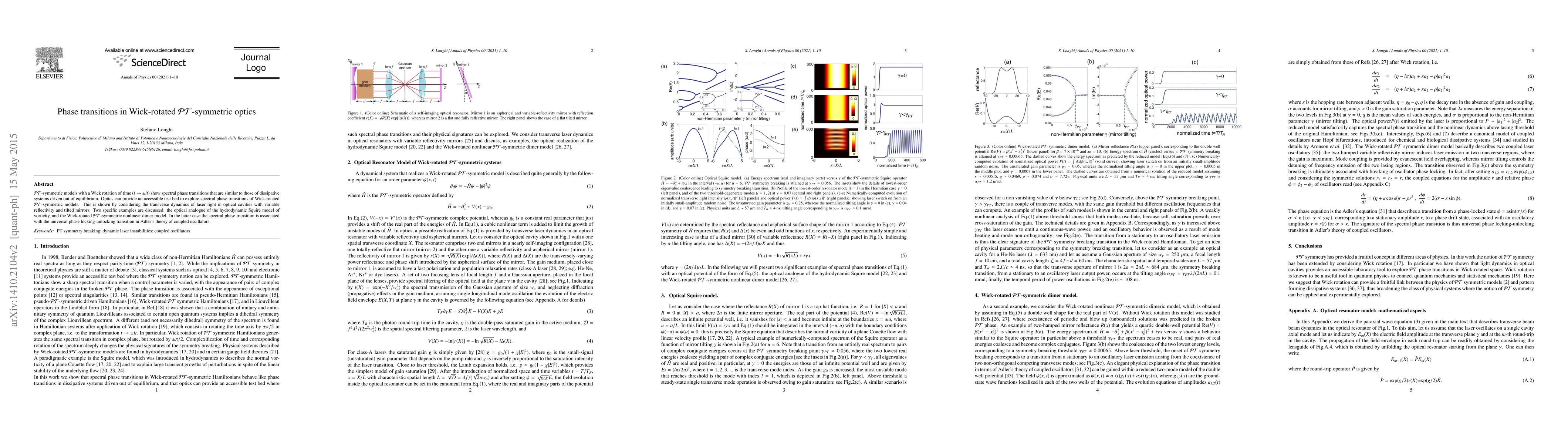$\mathcal{PT}$-symmetric models with a Wick rotation of time ($ t \rightarrow \pm i t$) show spectral phase transitions that are similar to those of dissipative systems driven out of equilibrium. Optics can provide an accessible test bed to explore spectral phase transitions of Wick-rotated $\mathcal{PT}$-symmetric models. This is shown by considering the transverse dynamics of laser light in optical cavities with variable reflectivity and tilted mirrors. As examples, we discuss in details the optical analogue of the hydrodynamic Squire model of vorticity and the Wick-rotated $\mathcal{PT}$-symmetric nonlinear dimer model.