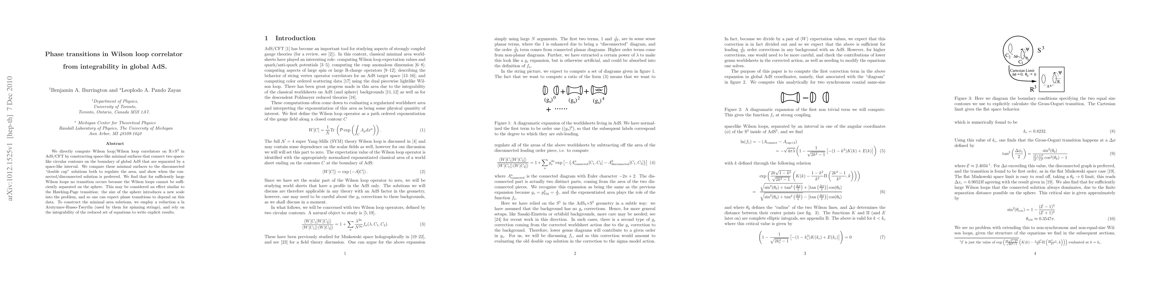 This paper computes Wilson loop correlators in global AdS using minimal surfaces and finds that large loops do not exhibit phase transitions due to the sphere's size, akin to the Hawking-Page transition, employing integrability techniques to derive explicit results.