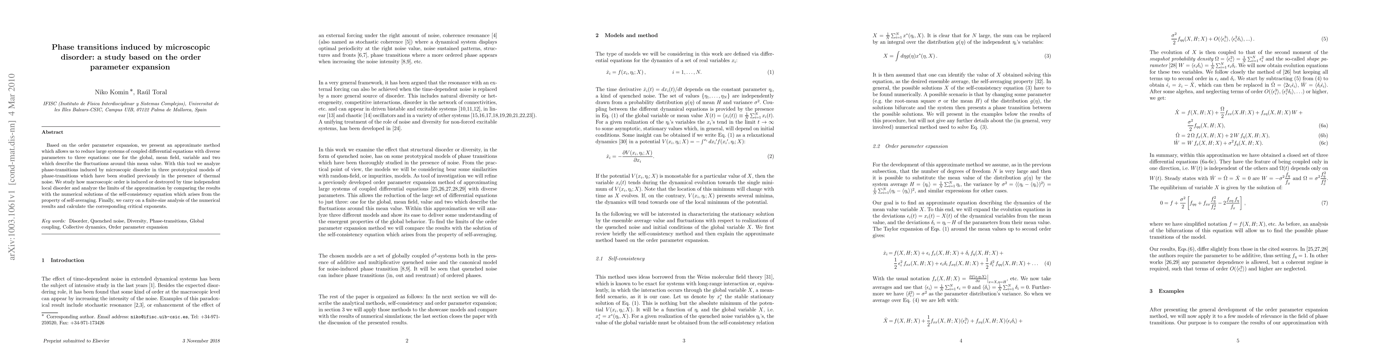 Based on the order parameter expansion, we present an approximate method which allows us to reduce large systems of coupled differential equations with diverse parameters to three equations: one for the global, mean field, variable and two which describe the fluctuations around this mean value. With this tool we analyze phase-transitions induced by microscopic disorder in three prototypical models of phase-transitions which have been studied previously in the presence of thermal noise. We study how macroscopic order is induced or destroyed by time independent local disorder and analyze the limits of the approximation by comparing the results with the numerical solutions of the self-consistency equation which arises from the property of self-averaging. Finally, we carry on a finite-size analysis of the numerical results and calculate the corresponding critical exponents.