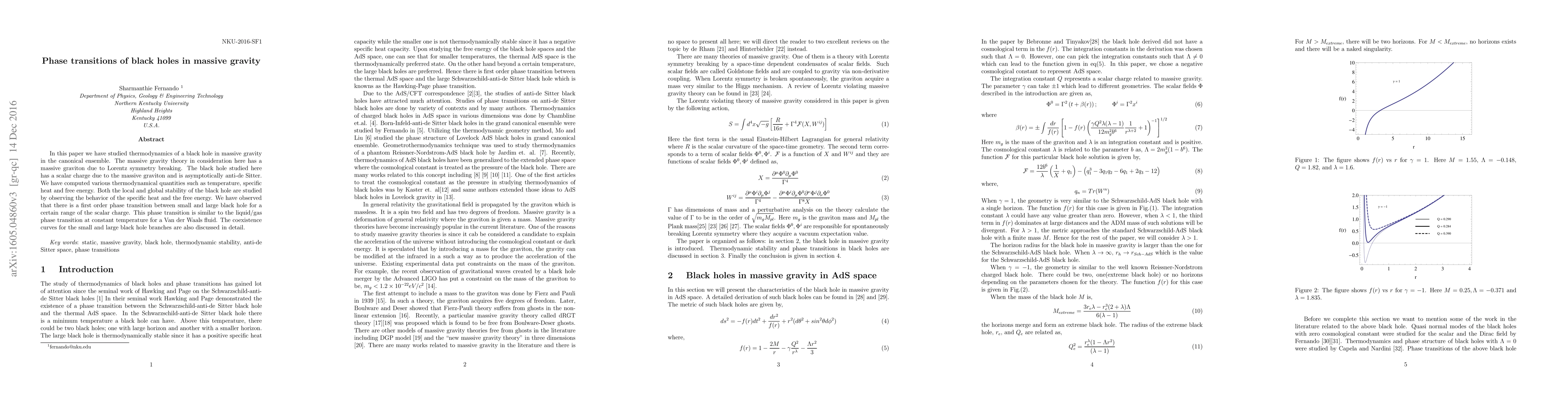 This paper investigates the thermodynamics of black holes in massive gravity, revealing a first-order phase transition between small and large black holes akin to a liquid/gas transition, driven by the presence of a scalar charge due to a massive graviton. The stability of the black holes is analyzed through specific heat and free energy behavior.