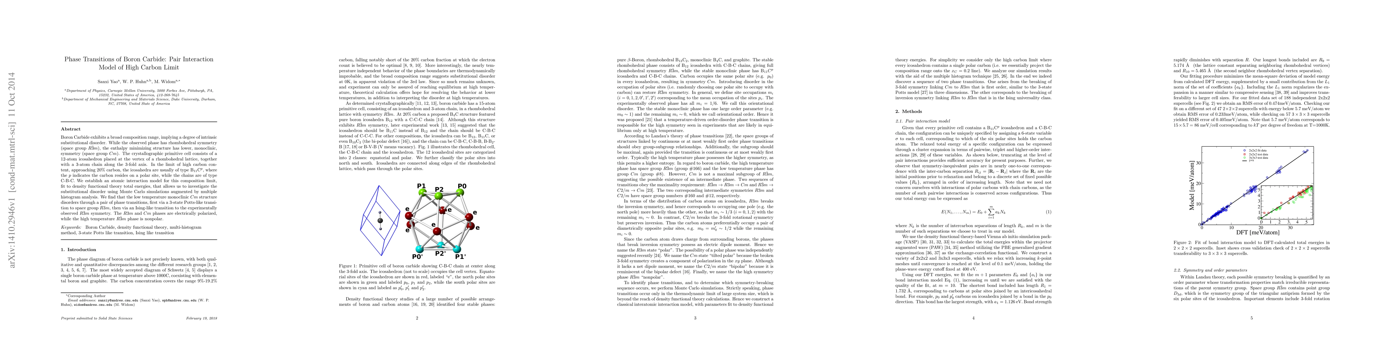 Boron Carbide exhibits a broad composition range, implying a degree of intrinsic substitutional disorder. While the observed phase has rhombohedral symmetry (space group R3(bar)m), the enthalpy minimizing structure has lower, monoclinic, symmetry (space group Cm). The crystallographic primitive cell consists of a 12-atom icosahedron placed at the vertex of a rhombohedral lattice, together with a 3-atom chain along the 3-fold axis. In the limit of high carbon content, approaching 20% carbon, the icosahedra are usually of type B11Cp, where the p indicates the carbon resides on a polar site, while the chains are of type C-B-C. We establish an atomic interaction model for this composition limit, fit to density functional theory total energies, that allows us to investigate the substitutional disorder using Monte Carlo simulations augmented by multiple histogram analysis. We find that the low temperature monoclinic Cm structure disorders through a pair of phase transitions, first via a 3-state Potts-like transition to space group R3m, then via an Ising-like transition to the experimentally observed R3(bar)m symmetry. The R3m and Cm phases are electrically polarized, while the high temperature R3(bar)m phase is nonpolar.