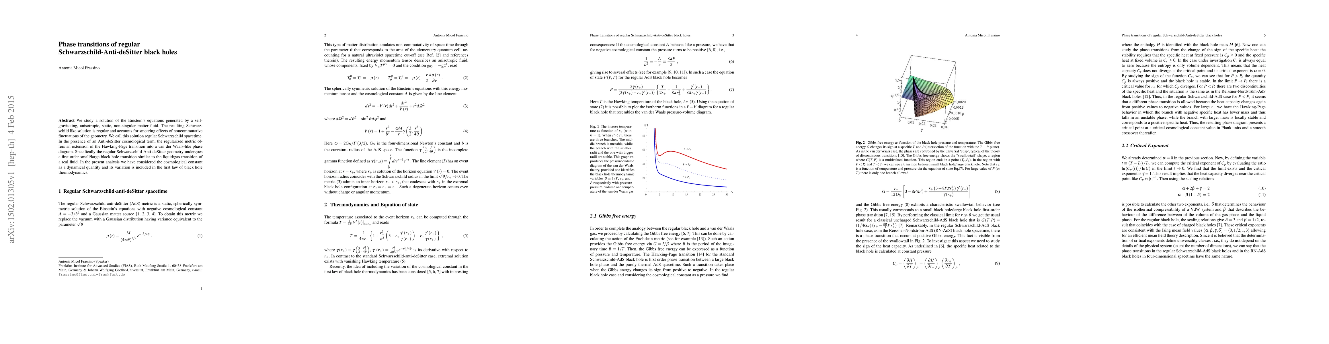 We study a solution of the Einstein's equations generated by a self-gravitating, anisotropic, static, non-singular matter fluid. The resulting Schwarzschild like solution is regular and accounts for smearing effects of noncommutative fluctuations of the geometry. We call this solution regular Schwarzschild spacetime. In the presence of an Anti-deSitter cosmological term, the regularized metric offers an extension of the Hawking-Page transition into a van der Waals-like phase diagram. Specifically the regular Schwarzschild-Anti-deSitter geometry undergoes a first order small/large black hole transition similar to the liquid/gas transition of a real fluid. In the present analysis we have considered the cosmological constant as a dynamical quantity and its variation is included in the first law of black hole thermodynamics.