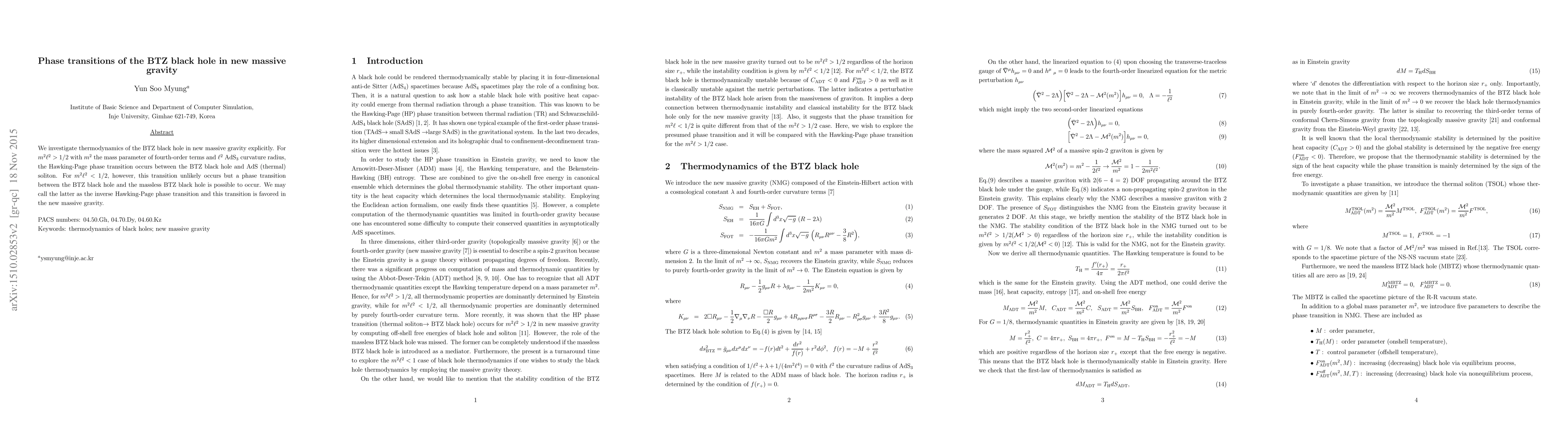 This research explores the thermodynamics of BTZ black holes in new massive gravity, revealing a Hawking-Page phase transition between BTZ black holes and AdS solitons for $m^2\ell^2>1/2$. For $m^2\ell^2<1/2$, an inverse Hawking-Page transition between BTZ and massless BTZ black holes is favored instead.