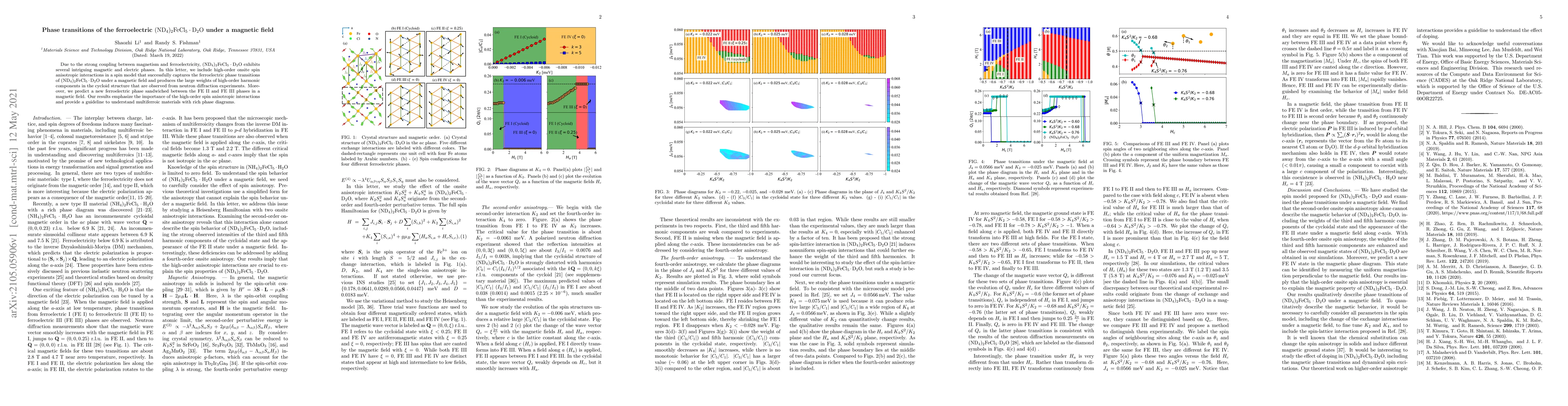 This paper investigates the phase transitions of the ferroelectric compound $(\mathrm{ND}_4)_2\mathrm{FeCl}_5\cdot\mathrm{D}_2\mathrm{O}$ under a magnetic field, revealing new insights into its magnetic and electric phases through a spin model that incorporates high-order onsite spin anisotropic interactions. The study predicts a new ferroelectric phase and highlights the significance of these interactions in multiferroic materials.