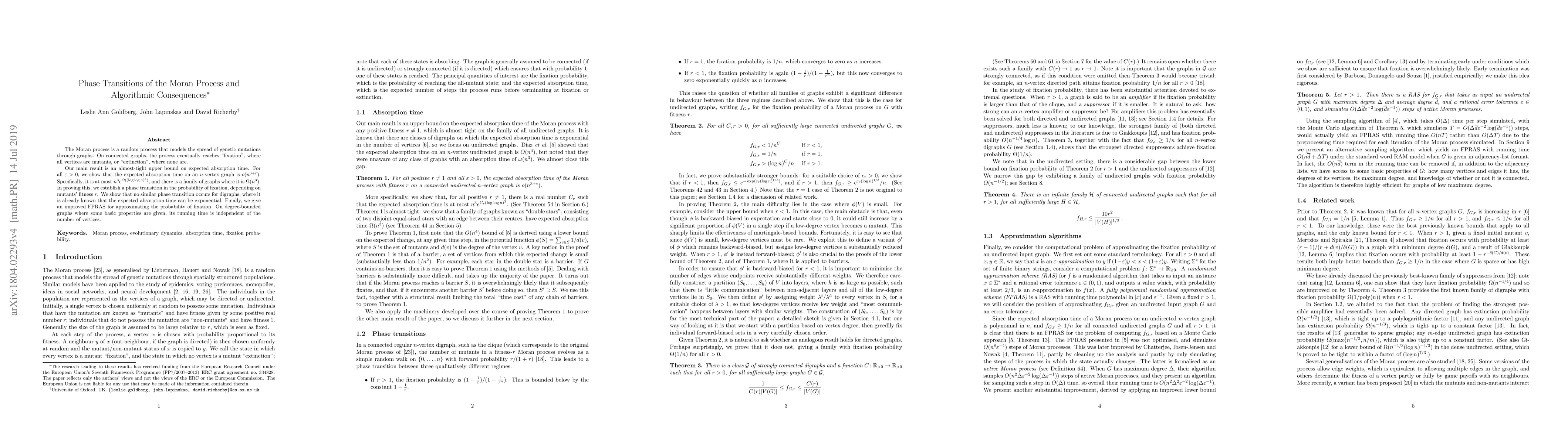 This research paper presents an almost-tight bound on the expected absorption time of the Moran process, a model for genetic mutation spread on graphs, which is shown to be O(n^3 * exp(O((log log n)^3))) and Omega(n^3) for certain graph families. The study also identifies a phase transition in fixation probability based on mutation fitness, contrasting with digraphs. Lastly, it introduces an improved approximation algorithm for fixation probability with running time independent of graph size under degree and property constraints.