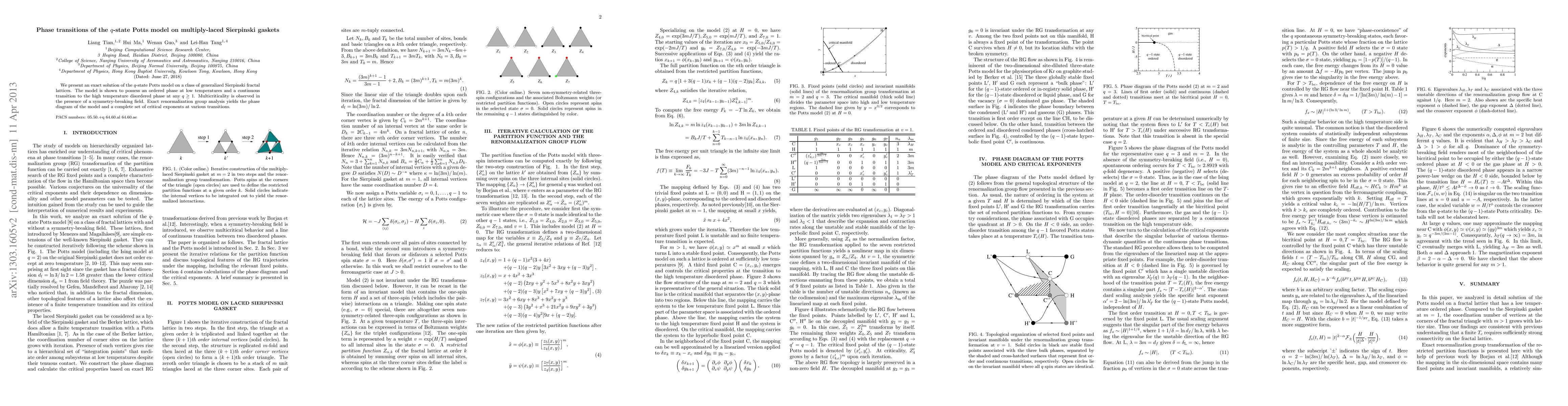 This paper presents an exact solution for the q-state Potts model on generalized Sierpinski fractal lattices, revealing an ordered phase at low temperatures and a continuous transition to a disordered phase at high temperatures for q>=1, with observed multicriticality in the presence of a symmetry-breaking field. The study provides the phase diagram and critical exponents through exact renormalization group analysis.