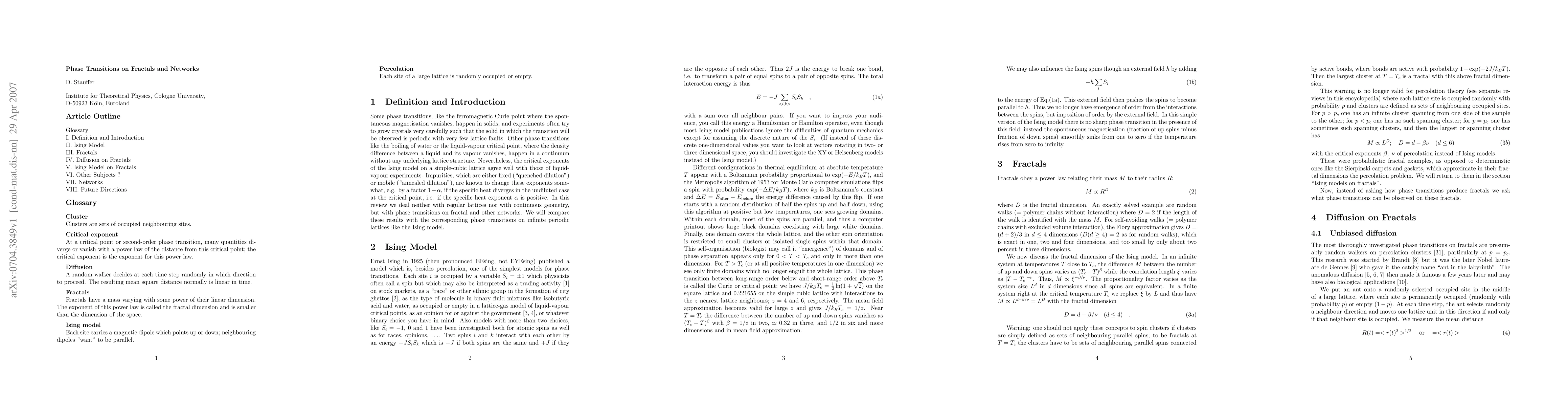 For Encyclopedia of Complexist and System Science No abstract given I. Definition and Introduction II. Ising Model III. Fractals IV. Diffusion on Fractals V. Ising Model on Fractals VI. Other Subjects ? VII. Networks VIII. Future Directions