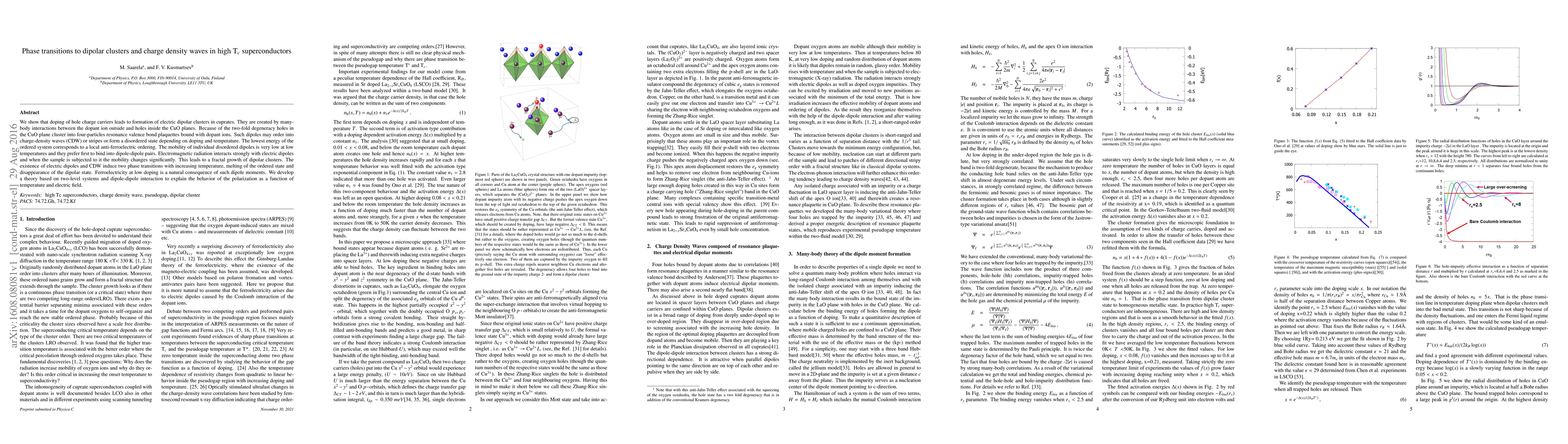 This research proposes that hole doping in cuprate high-temperature superconductors forms electric dipolar clusters via many-body interactions. These dipoles can order into charge-density waves or remain disordered, depending on doping and temperature, with a low-temperature preference for dipole-dipole pairing. The study reveals two phase transitions with temperature increase, and suggests ferroelectricity at low doping due to these dipole moments, supported by a theory based on two-level systems and dipole-dipole interactions.