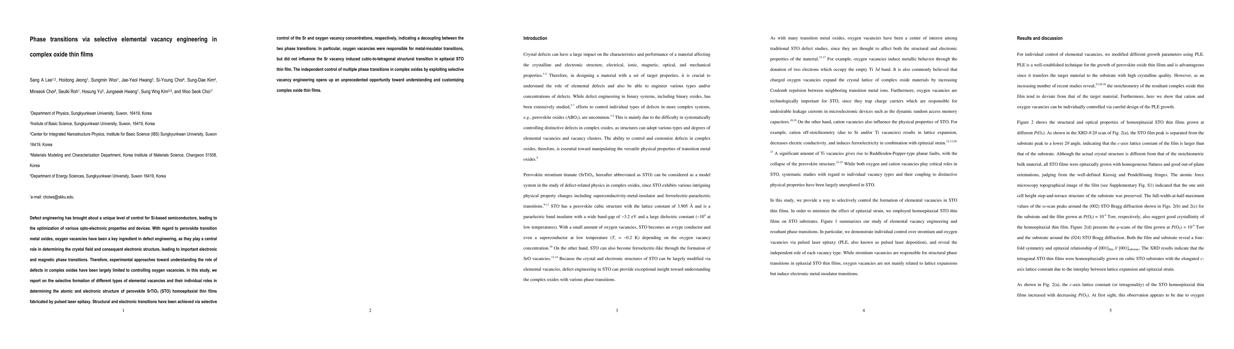 Defect engineering has brought about a unique level of control for Si-based semiconductors, leading to the optimization of various opto-electronic properties and devices. With regard to perovskite transition metal oxides, oxygen vacancies have been a key ingredient in defect engineering, as they play a central role in determining the crystal field and consequent electronic structure, leading to important electronic and magnetic phase transitions. Therefore, experimental approaches toward understanding the role of defects in complex oxides have been largely limited to controlling oxygen vacancies. In this study, we report on the selective formation of different types of elemental vacancies and their individual roles in determining the atomic and electronic structure of perovskite SrTiO3 (STO) homoepitaxial thin films fabricated by pulsed laser epitaxy. Structural and electronic transitions have been achieved via selective control of the Sr and oxygen vacancy concentrations, respectively, indicating a decoupling between the two phase transitions. In particular, oxygen vacancies were responsible for metal-insulator transitions, but did not influence the Sr vacancy induced cubic-to-tetragonal structural transition in epitaxial STO thin film. The independent control of multiple phase transitions in complex oxides by exploiting selective vacancy engineering opens up an unprecedented opportunity toward understanding and customizing complex oxide thin films.