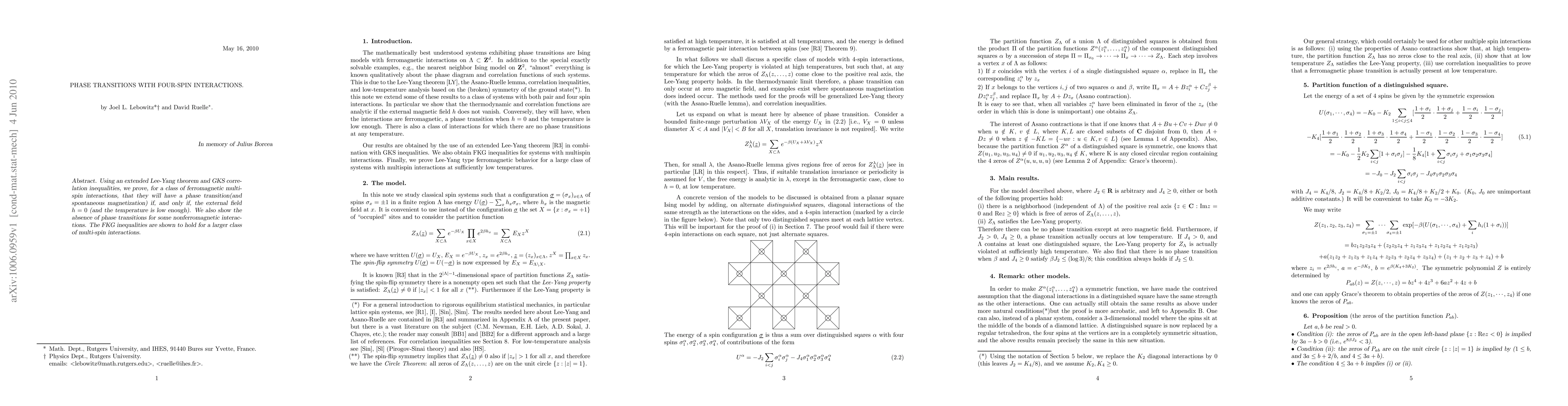 Using an extended Lee-Yang theorem and GKS correlation inequalities, we prove, for a class of ferromagnetic multi-spin interactions, that they will have a phase transition(and spontaneous magnetization) if, and only if, the external field $h=0$ (and the temperature is low enough). We also show the absence of phase transitions for some nonferromagnetic interactions. The FKG inequalities are shown to hold for a larger class of multi-spin interactions.
