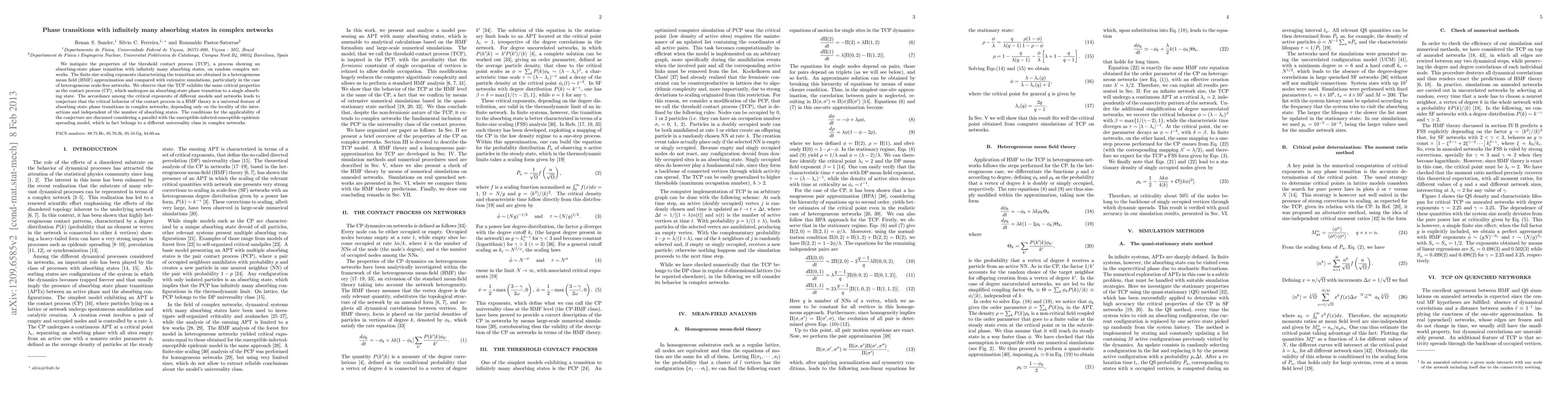 This paper investigates the threshold contact process on complex networks, revealing an absorbing-state phase transition with infinitely many absorbing states. The study finds that the critical behavior of the process is universal, dependent on interaction locality rather than the number of absorbing states, as evidenced by comparisons with simulations on heterogeneous scale-free networks.