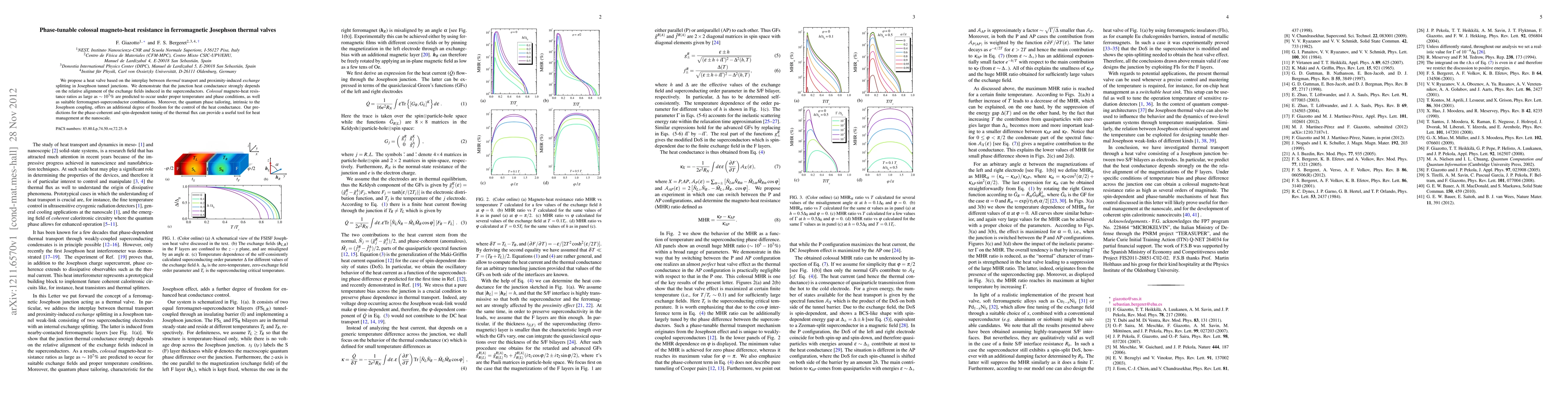This paper proposes a heat valve utilizing ferromagnetic Josephson tunnel junctions, where the heat conductance is strongly influenced by the alignment of exchange fields in superconductors, achieving colossal magneto-heat resistance ratios up to 10^7%. The quantum phase tailoring inherent in Josephson coupling allows for phase-coherent and spin-dependent control of thermal flux, offering a nanoscale heat management tool.