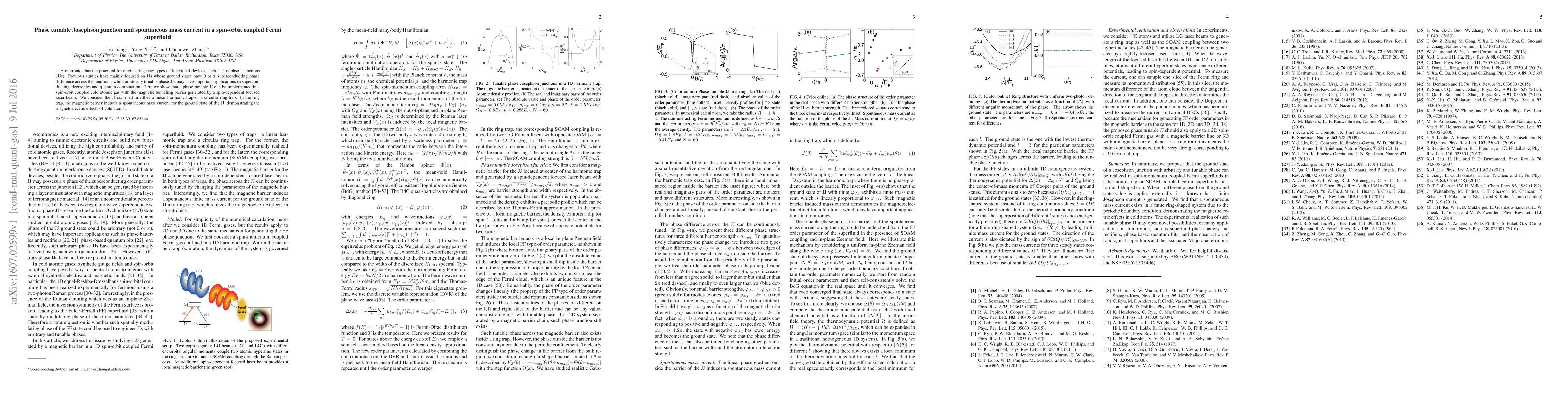 This paper demonstrates the implementation of a phase tunable Josephson junction in a spin-orbit coupled Fermi superfluid using cold atomic gases, with a magnetic tunneling barrier created by a spin-dependent focused laser beam. The study reveals spontaneous mass current in a circular ring trap configuration, showcasing magnetoelectric effects in cold atoms.