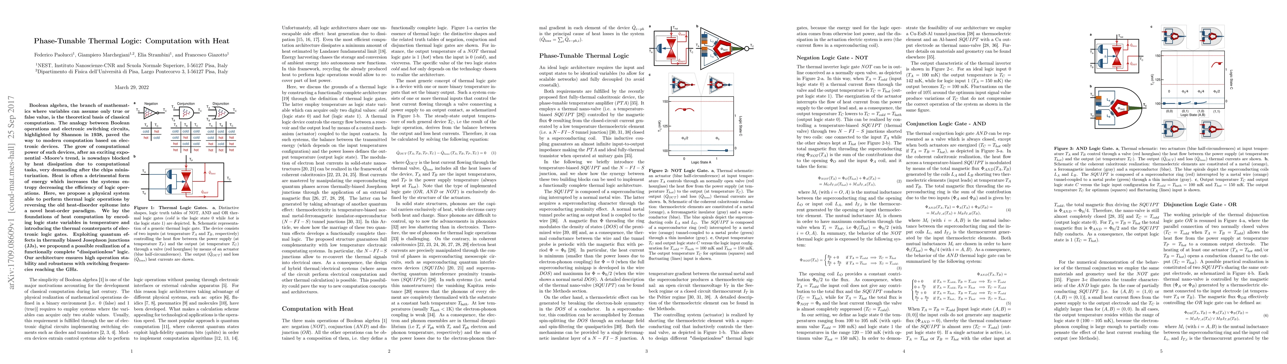 Boolean algebra, the branch of mathematics where variables can assume only true or false value, is the theoretical basis of classical computation. The analogy between Boolean operations and electronic switching circuits, highlighted by Shannon in 1938, paved the way to modern computation based on electronic devices. The grow of computational power of such devices, after an exciting exponential -Moore trend, is nowadays blocked by heat dissipation due to computational tasks, very demanding after the chips miniaturization. Heat is often a detrimental form of energy which increases the systems entropy decreasing the efficiency of logic operations. Here, we propose a physical system able to perform thermal logic operations by reversing the old heat-disorder epitome into a novel heat-order paradigm. We lay the foundations of heat computation by encoding logic state variables in temperature and introducing the thermal counterparts of electronic logic gates. Exploiting quantum effects in thermally biased Josephson junctions (JJs), we propound a possible realization of a functionally complete dissipationless logic. Our architecture ensures high operation stability and robustness with switching frequencies reaching the GHz.