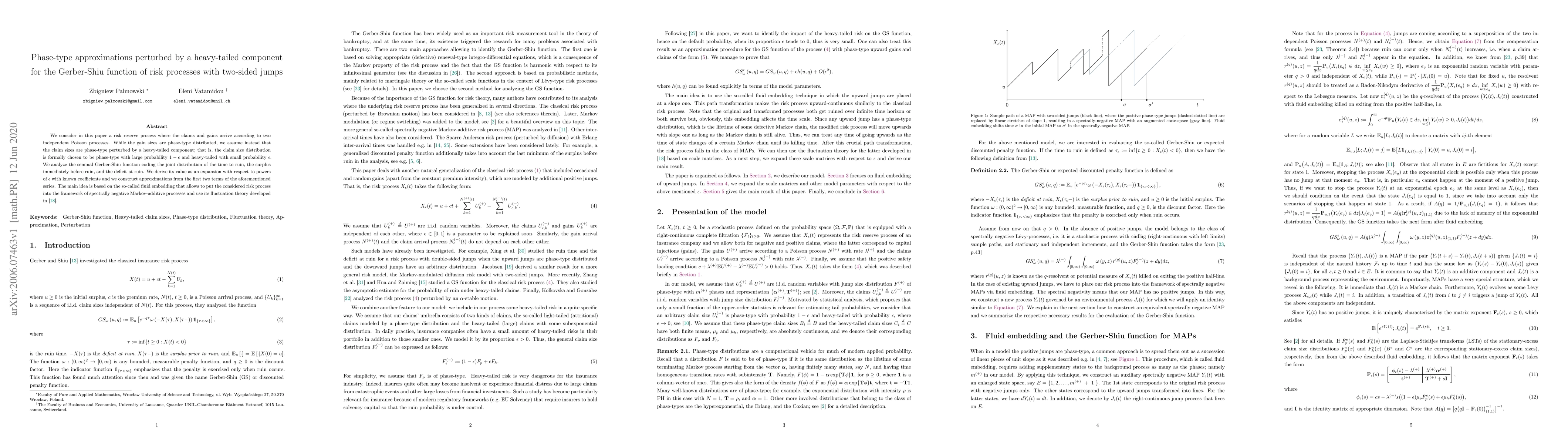 We consider in this paper a risk reserve process where the claims and gains arrive according to two independent Poisson processes. While the gain sizes are phase-type distributed, we assume instead that the claim sizes are phase-type perturbed by a heavy-tailed component; that is, the claim size distribution is formally chosen to be phase-type with large probability $1-\epsilon$ and heavy-tailed with small probability $\epsilon$. We analyze the seminal Gerber-Shiu function coding the joint distribution of the time to ruin, the surplus immediately before ruin, and the deficit at ruin. We derive its value as an expansion with respect to powers of $\epsilon$ with known coefficients and we construct approximations from the first two terms of the aforementioned series. The main idea is based on the so-called fluid embedding that allows to put the considered risk process into the framework of spectrally negative Markov-additive processes and use its fluctuation theory developed in Ivanovs and Palmowski (2012).