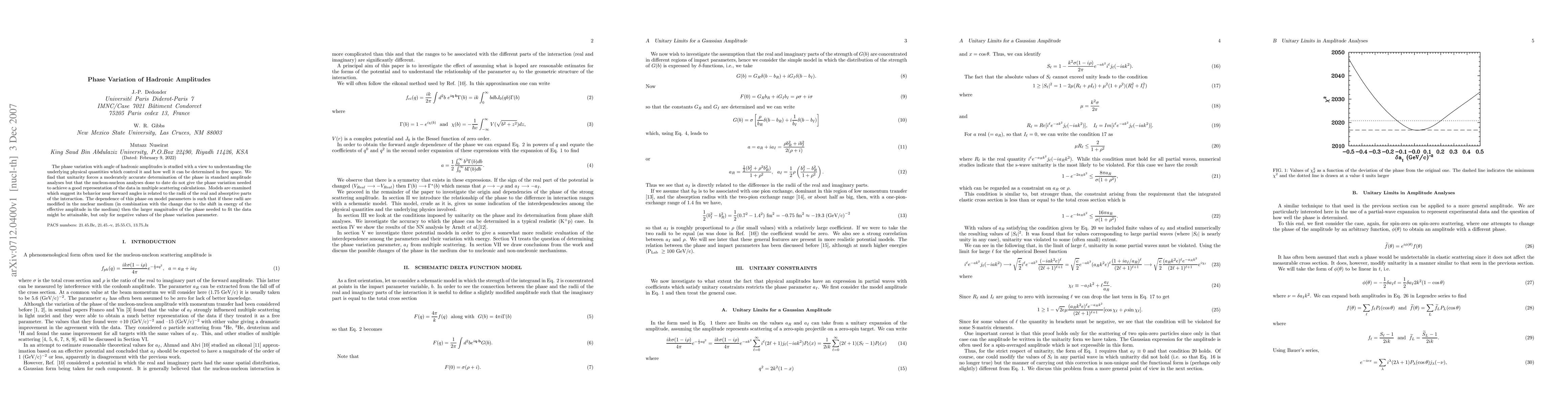 The phase variation with angle of hadronic amplitudes is studied with a view to understanding the underlying physical quantities which control it and how well it can be determined in free space. We find that unitarity forces a moderately accurate determination of the phase in standard amplitude analyses but that the nucleon-nucleon analyses done to date do not give the phase variation needed to achieve a good representation of the data in multiple scattering calculations. Models are examined which suggest its behavior near forward angles is related to the radii of the real and absorptive parts of the interaction. The dependence of this phase on model parameters is such that if these radii are modified in the nuclear medium (in combination with the change due to the shift in energy of the effective amplitude in the medium) then the larger magnitudes of the phase needed to fit the data might be attainable, but only for negative values of the phase variation parameter.