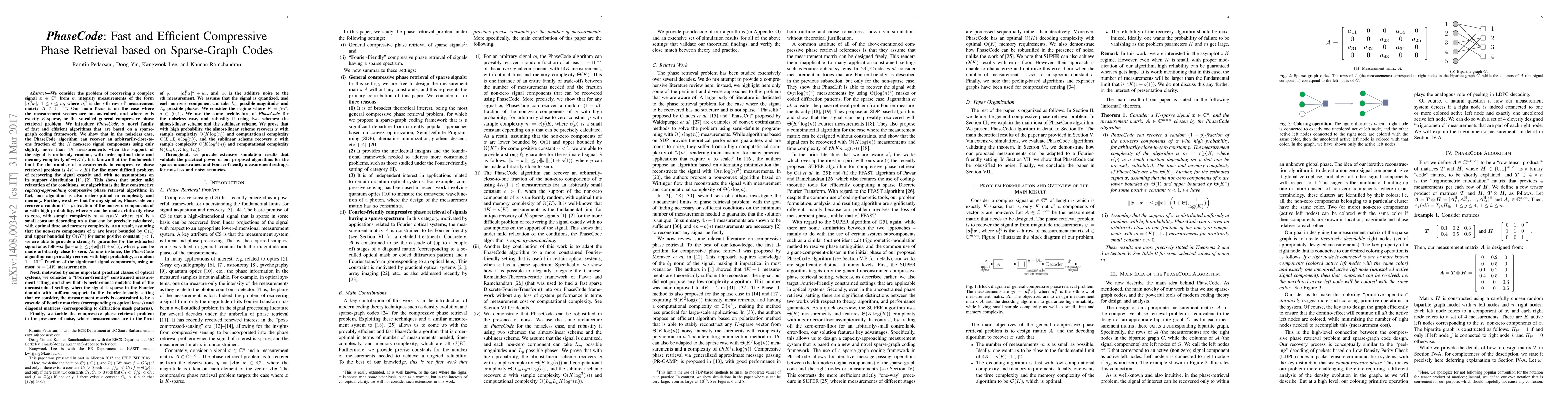 The PhaseCode algorithm efficiently recovers $K$-sparse complex signals from compressive phase measurements using slightly more than $4K$ measurements, achieving near-optimal performance with $\Theta(K)$ complexity. It also extends to Fourier-friendly settings and demonstrates robustness to noise, validated by extensive simulations.