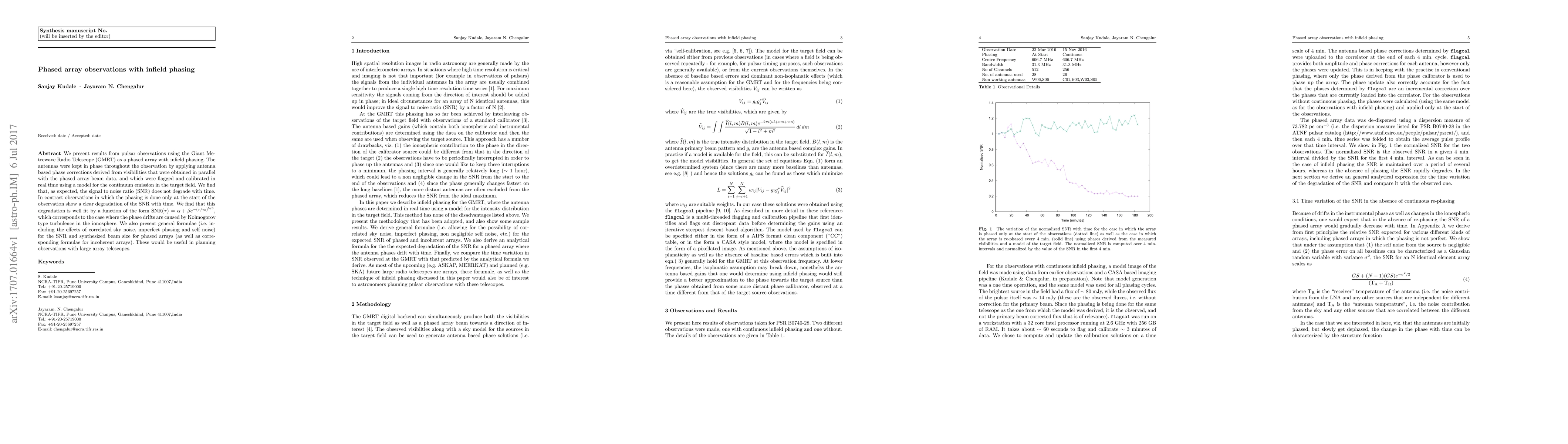 We present results from pulsar observations using the Giant Metrewave Radio Telescope (GMRT) as a phased array with infield phasing. The antennas were kept in phase throughout the observation by applying antenna based phase corrections derived from visibilities that were obtained in parallel with the phased array beam data, and which were flagged and calibrated in real time using a model for the continuum emission in the target field. We find that, as expected, the signal to noise ratio (SNR) does not degrade with time. In contrast observations in which the phasing is done only at the start of the observation show a clear degradation of the SNR with time. We find that this degradation is well fit by a function of the form SNR(t) =a + b*exp(-(t/t0)^5/3), which corresponds to the case where the phase drifts are caused by Kolmogorov type turbulence in the ionosphere. We also present general formulae (i.e. including the effects of correlated sky noise, imperfect phasing and self noise) for the SNR and synthesized beam size for phased arrays (as well as corresponding formulae for incoherent arrays). These would be useful in planning observations with large array telescopes.