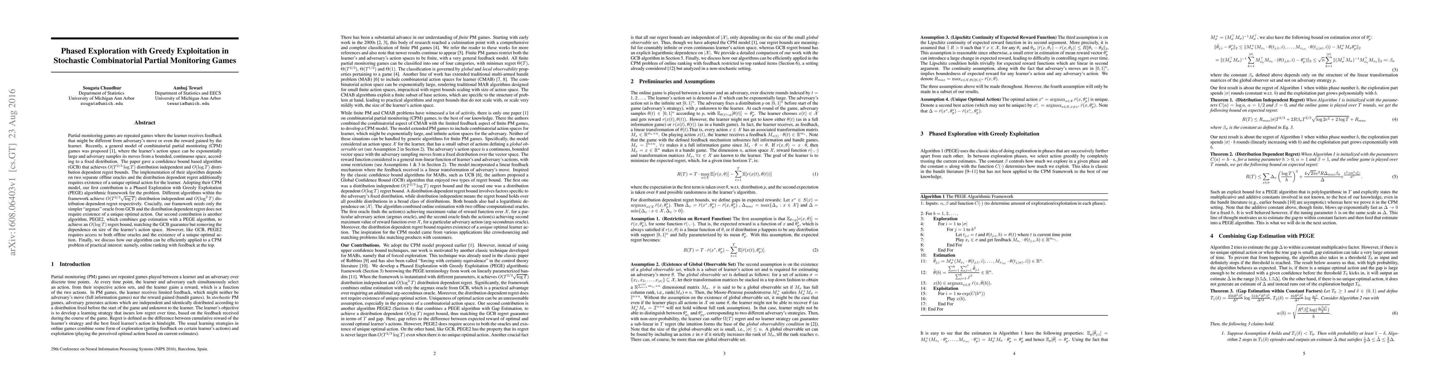 Researchers developed a new algorithmic framework for Phased Exploration with Greedy Exploitation in Stochastic Combinatorial Partial Monitoring Games, achieving better regret bounds than existing methods.