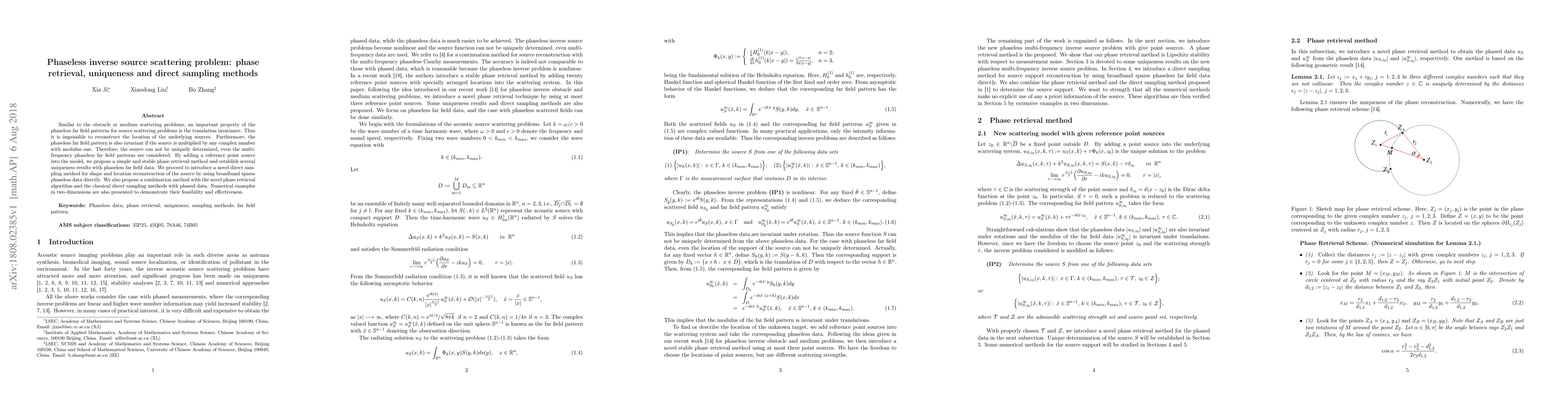 This paper addresses the phaseless inverse source scattering problem, highlighting the challenges of translation invariance and non-uniqueness. It proposes a phase retrieval method using a reference point source and introduces a direct sampling method for reconstructing source shape and location from broadband sparse phaseless data, supplemented by numerical examples in two dimensions.