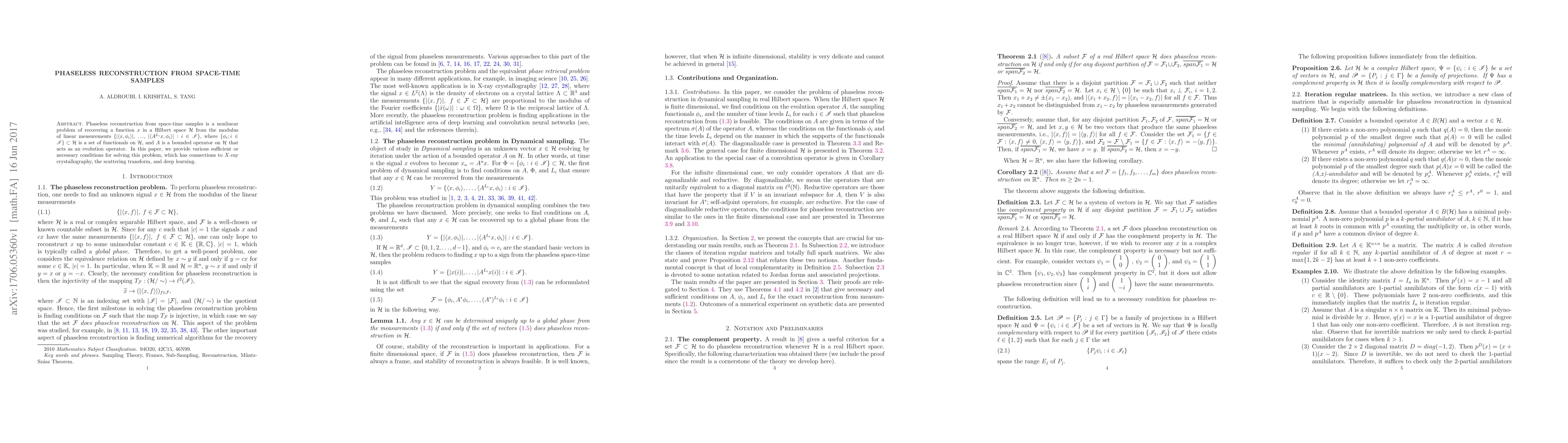 Phaseless reconstruction from space-time samples is a nonlinear problem of recovering a function $x$ in a Hilbert space $\mathcal{H}$ from the modulus of linear measurements $\{\lvert \langle x, \phi_i\rangle \rvert$, $ \ldots$, $\lvert \langle A^{L_i}x, \phi_i \rangle \rvert : i \in\mathscr I\}$, where $\{\phi_i; i \in\mathscr I\}\subset \mathcal{H}$ is a set of functionals on $\mathcal{H}$, and $A$ is a bounded operator on $\mathcal{H}$ that acts as an evolution operator. In this paper, we provide various sufficient or necessary conditions for solving this problem, which has connections to $X$-ray crystallography, the scattering transform, and deep learning.
