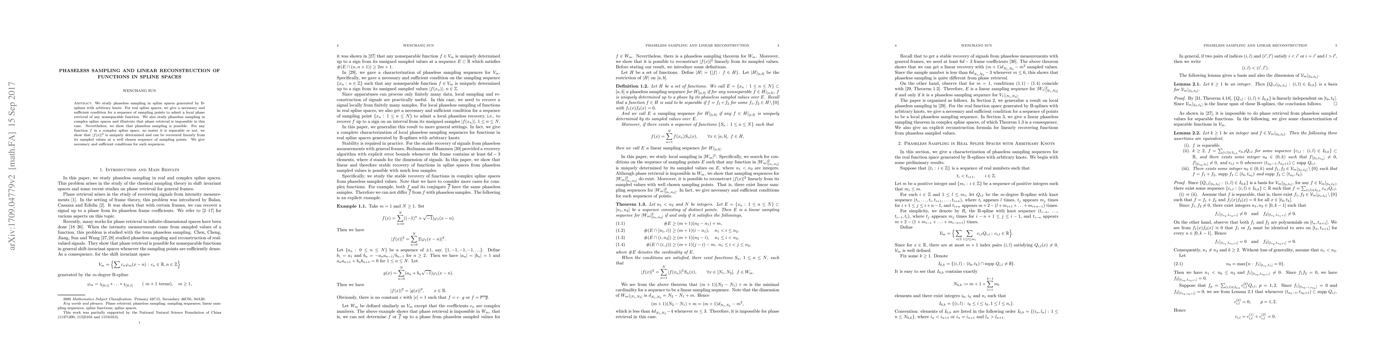 We study phaseless sampling in spline spaces generated by B-splines with arbitrary knots. For real spline spaces, we give a necessary and sufficient condition for a sequence of sampling points to admit a local phase retrieval of any nonseparable function. We also study phaseless sampling in complex spline spaces and illustrate that phase retrieval is impossible in this case. Nevertheless, we show that phaseless sampling is possible. For any function $f$ in a complex spline space, no mater it is separable or not, we show that $|f(x)|^2$ is uniquely determined and can be recovered linearly from its sampled values at a well chosen sequence of sampling points. We give necessary and sufficient conditions for such sequences.