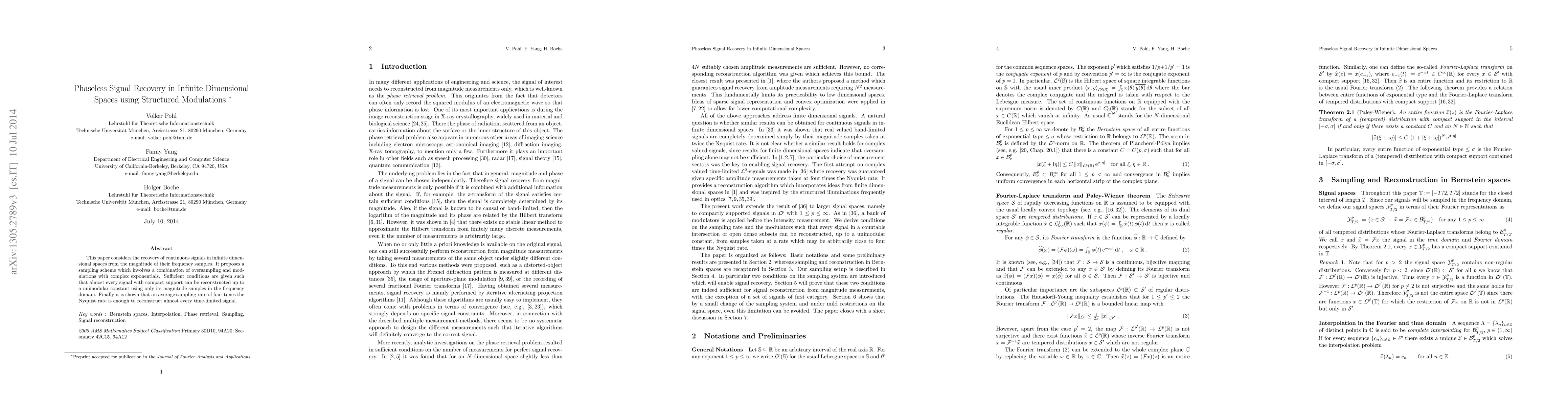 This paper considers the recovery of continuous signals in infinite dimensional spaces from the magnitude of their frequency samples. It proposes a sampling scheme which involves a combination of oversampling and modulations with complex exponentials. Sufficient conditions are given such that almost every signal with compact support can be reconstructed up to a unimodular constant using only its magnitude samples in the frequency domain. Finally it is shown that an average sampling rate of four times the Nyquist rate is enough to reconstruct almost every time-limited signal.