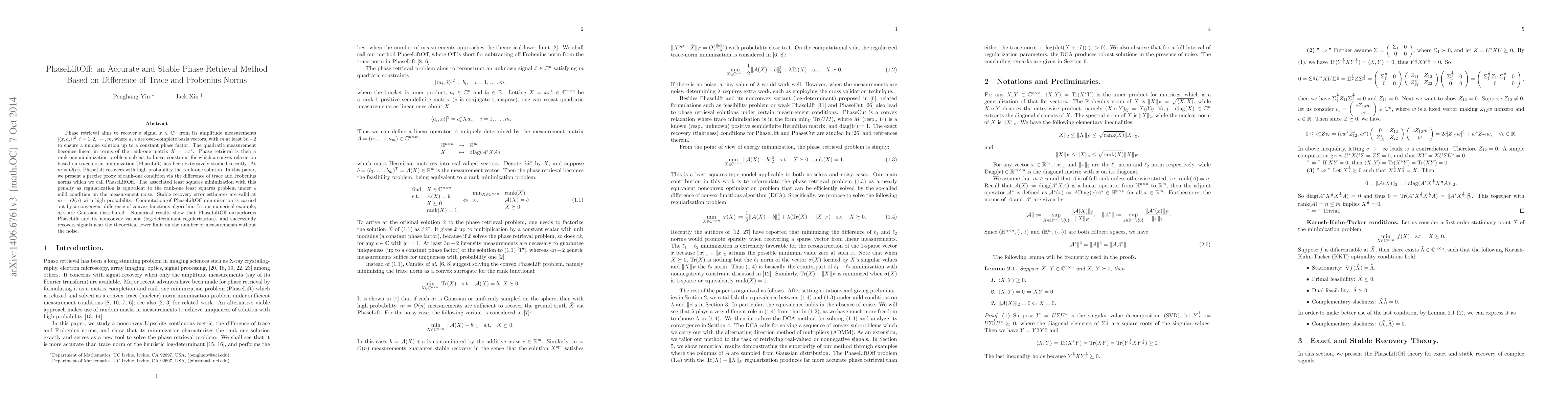 PhaseLiftOff is a novel phase retrieval method that uses the difference of trace and Frobenius norms to achieve accurate and stable signal recovery from amplitude measurements. It outperforms existing methods, including PhaseLift and its nonconvex variant, by providing stable recovery error estimates and better performance at lower measurement counts.