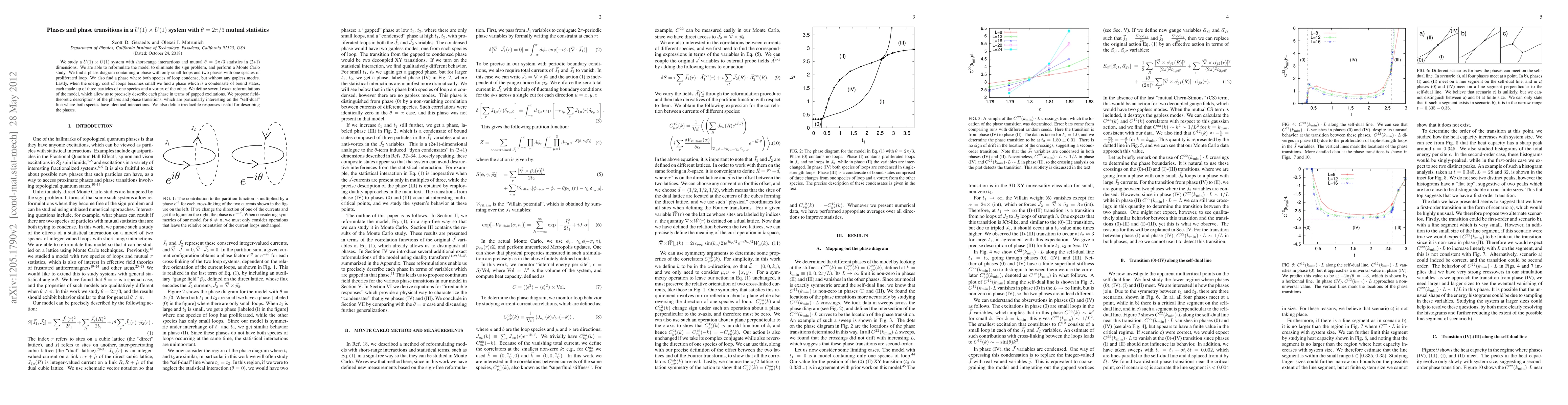 We study a $U(1)\times U(1)$ system with short-range interactions and mutual $\theta=2\pi/3$ statistics in (2+1) dimensions. We are able to reformulate the model to eliminate the sign problem, and perform a Monte Carlo study. We find a phase diagram containing a phase with only small loops and two phases with one species of proliferated loop. We also find a phase where both species of loop condense, but without any gapless modes. Lastly, when the energy cost of loops becomes small we find a phase which is a condensate of bound states, each made up of three particles of one species and a vortex of the other. We define several exact reformulations of the model, which allow us to precisely describe each phase in terms of gapped excitations. We propose field-theoretic descriptions of the phases and phase transitions, which are particularly interesting on the "self-dual" line where both species have identical interactions. We also define irreducible responses useful for describing the phases.