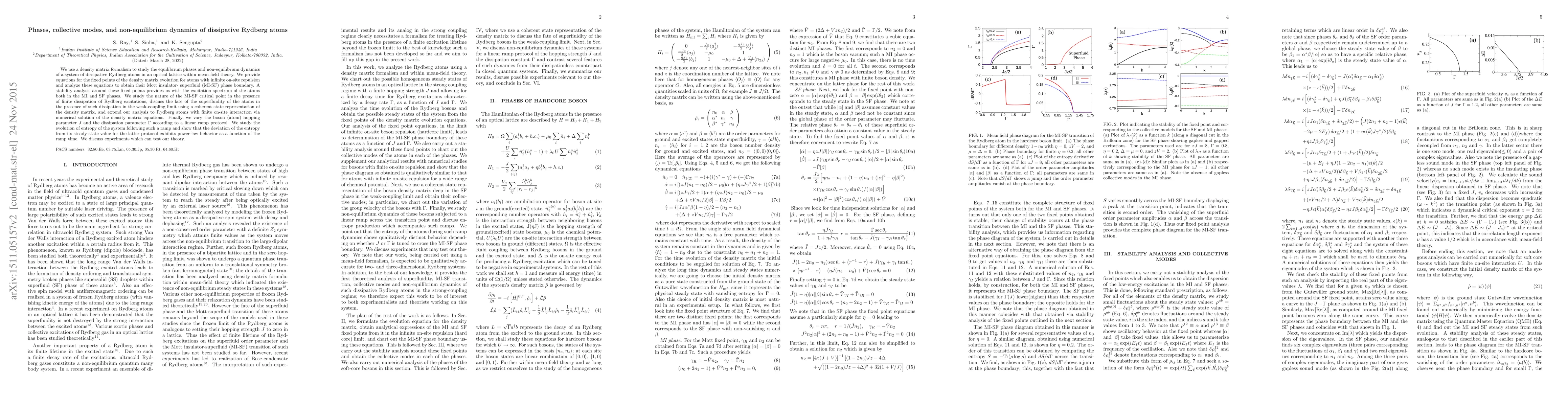 This paper employs a density matrix formalism to explore the equilibrium phases and non-equilibrium dynamics of dissipative Rydberg atoms in an optical lattice, identifying the Mott insulator-superfluid phase boundary and analyzing the system's stability and excitation spectrum. It also investigates the impact of finite dissipation on superfluidity and entropy evolution under a linear ramp protocol, revealing a power-law behavior in entropy deviation.