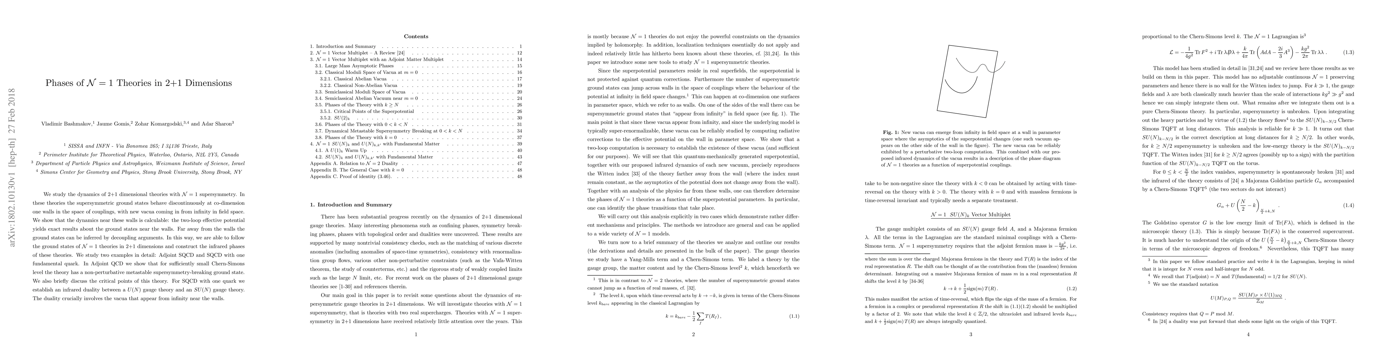 We study the dynamics of 2+1 dimensional theories with ${\cal N}=1$ supersymmetry. In these theories the supersymmetric ground states behave discontinuously at co-dimension one walls in the space of couplings, with new vacua coming in from infinity in field space. We show that the dynamics near these walls is calculable: the two-loop effective potential yields exact results about the ground states near the walls. Far away from the walls the ground states can be inferred by decoupling arguments. In this way, we are able to follow the ground states of ${\cal N}=1$ theories in 2+1 dimensions and construct the infrared phases of these theories. We study two examples in detail: Adjoint SQCD and SQCD with one fundamental quark. In Adjoint QCD we show that for sufficiently small Chern-Simons level the theory has a non-perturbative metastable supersymmetry-breaking ground state. We also briefly discuss the critical points of this theory. For SQCD with one quark we establish an infrared duality between a $U(N)$ gauge theory and an $SU(N)$ gauge theory. The duality crucially involves the vacua that appear from infinity near the walls.