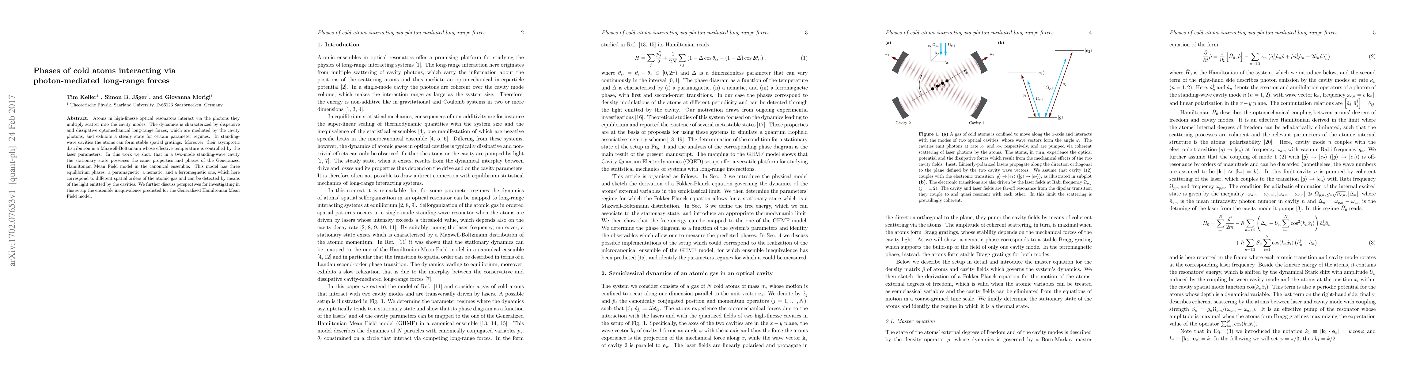 Atoms in high-finesse optical resonators interact via the photons they multiply scatter into the cavity modes. The dynamics is characterized by dispersive and dissipative optomechanical long-range forces, which are mediated by the cavity photons, and exhibits a steady state for certain parameter regimes. In standing-wave cavities the atoms can form stable spatial gratings. Moreover, their asymptotic distribution is a Maxwell-Boltzmann whose effective temperature is controlled by the laser parameters. In this work we show that in a two-mode standing-wave cavity the stationary state possesses the same properties and phases of the Generalized Hamiltonian Mean Field model in the canonical ensemble. This model has three equilibrium phases: a paramagnetic, a nematic, and a ferromagnetic one, which here correspond to different spatial orders of the atomic gas and can be detected by means of the light emitted by the cavities. We further discuss perspectives for investigating in this setup the ensemble inequivalence predicted for the Generalized Hamiltonian Mean Field model.
