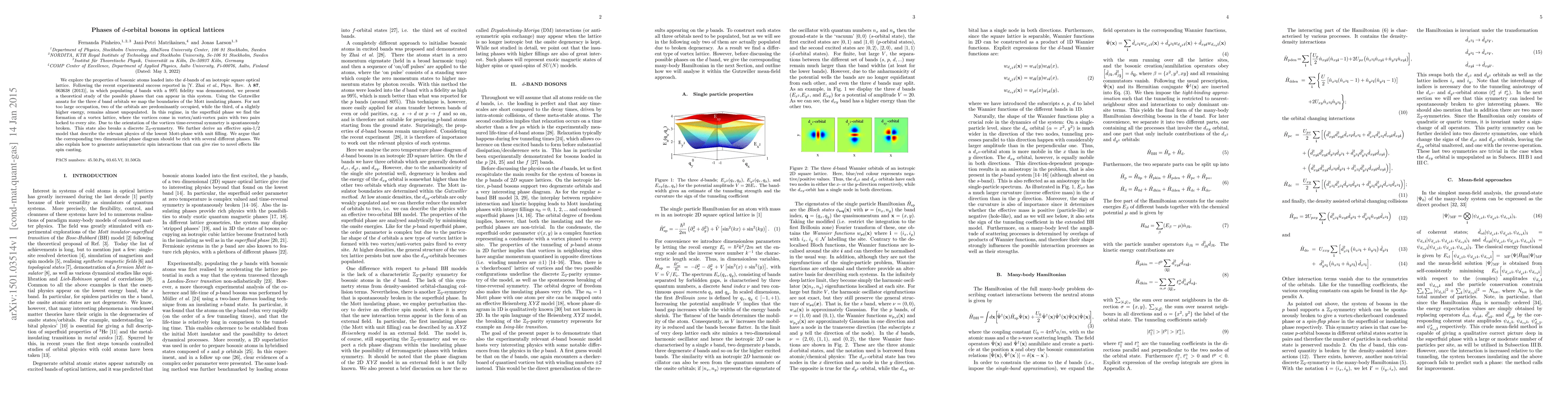 We explore the properties of bosonic atoms loaded into the d bands of an isotropic square optical lattice. Following the recent experimental success reported in [Y. Zhai et al., Phys. Rev. A 87, 063638 (2013)], in which populating d bands with a 99% fidelity was demonstrated, we present a theoretical study of the possible phases that can appear in this system. Using the Gutzwiller ansatz for the three d band orbitals we map the boundaries of the Mott insulating phases. For not too large occupation, two of the orbitals are predominantly occupied, while the third, of a slightly higher energy, remains almost unpopulated. In this regime, in the superfluid phase we find the formation of a vortex lattice, where the vortices come in vortex/anti-vortex pairs with two pairs locked to every site. Due to the orientation of the vortices time-reversal symmetry is spontaneously broken. This state also breaks a discrete Z2-symmetry. We further derive an effective spin-1/2 model that describe the relevant physics of the lowest Mott-phase with unit filling. We argue that the corresponding two dimensional phase diagram should be rich with several different phases. We also explain how to generate antisymmetric spin interactions that can give rise to novel effects like spin canting.