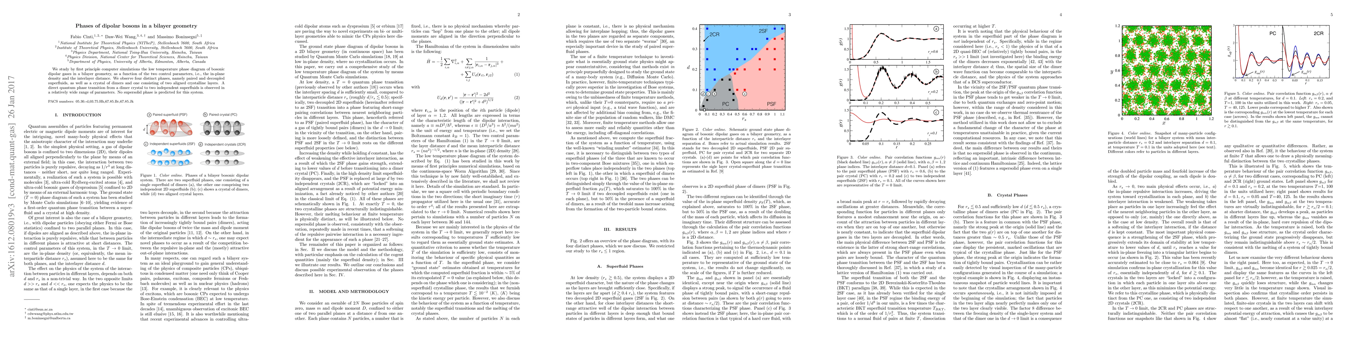 This study uses first-principle simulations to explore the low-temperature phase diagram of dipolar bosonic gases in a bilayer setup, identifying four phases: paired and decoupled superfluids, a dimer crystal, and a two-layer crystalline phase. A notable finding is a direct quantum phase transition between a dimer crystal and independent superfluids, with no supersolid phase observed.
