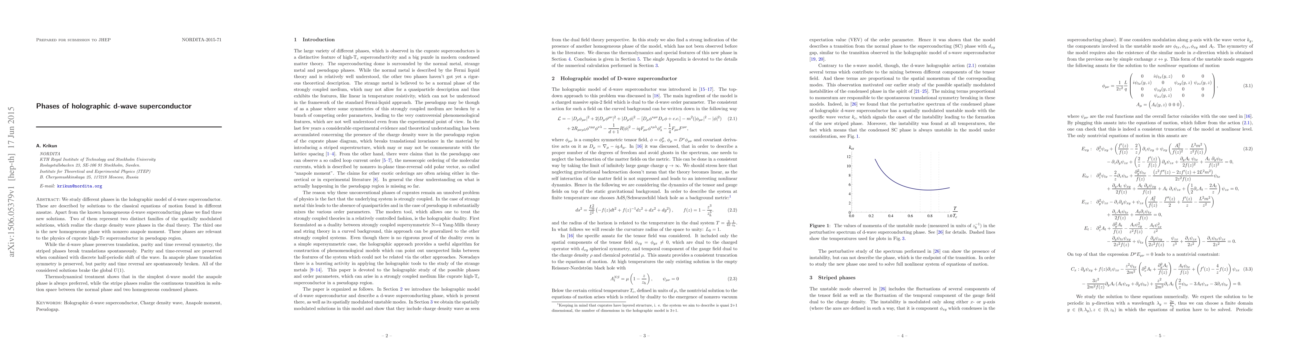 This paper investigates the holographic model of d-wave superconductivity, identifying four distinct phases: a known homogeneous d-wave phase and three new phases—two modulated charge density wave phases and a novel anapole phase. The new phases show different symmetry properties and thermodynamical preferences, with the anapole phase being thermodynamically favored in the simplest model.