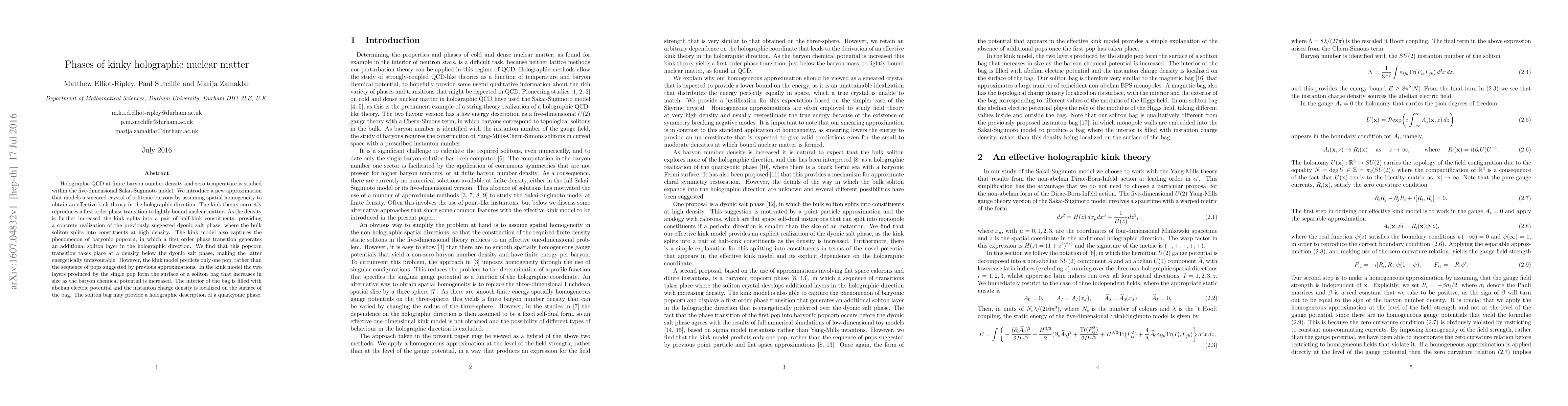 Holographic QCD at finite baryon number density and zero temperature is studied within the five-dimensional Sakai-Sugimoto model. We introduce a new approximation that models a smeared crystal of solitonic baryons by assuming spatial homogeneity to obtain an effective kink theory in the holographic direction. The kink theory correctly reproduces a first order phase transition to lightly bound nuclear matter. As the density is further increased the kink splits into a pair of half-kink constituents, providing a concrete realization of the previously suggested dyonic salt phase, where the bulk soliton splits into constituents at high density. The kink model also captures the phenomenon of baryonic popcorn, in which a first order phase transition generates an additional soliton layer in the holographic direction. We find that this popcorn transition takes place at a density below the dyonic salt phase, making the latter energetically unfavourable. However, the kink model predicts only one pop, rather than the sequence of pops suggested by previous approximations. In the kink model the two layers produced by the single pop form the surface of a soliton bag that increases in size as the baryon chemical potential is increased. The interior of the bag is filled with abelian electric potential and the instanton charge density is localized on the surface of the bag. The soliton bag may provide a holographic description of a quarkyonic phase.