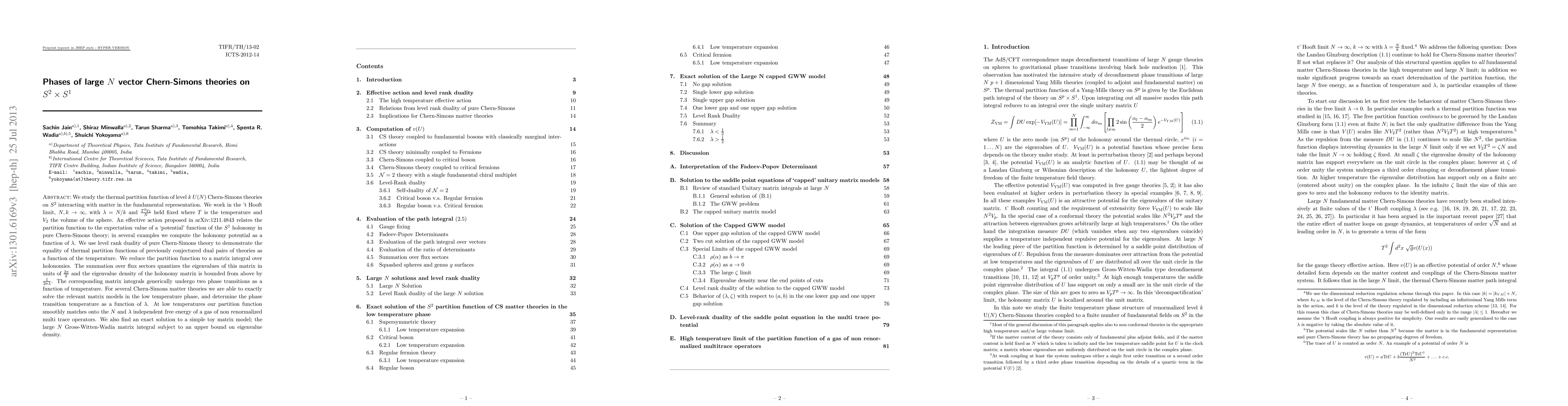 We study the thermal partition function of level $k$ U(N) Chern-Simons theories on $S^2$ interacting with matter in the fundamental representation. We work in the 't Hooft limit, $N,k\to\infty$, with $\lambda = N/k$ and $\frac{T^2 V_{2}}{N}$ held fixed where $T$ is the temperature and $V_{2}$ the volume of the sphere. An effective action proposed in arXiv:1211.4843 relates the partition function to the expectation value of a `potential' function of the $S^1$ holonomy in pure Chern-Simons theory; in several examples we compute the holonomy potential as a function of $\lambda$. We use level rank duality of pure Chern-Simons theory to demonstrate the equality of thermal partition functions of previously conjectured dual pairs of theories as a function of the temperature. We reduce the partition function to a matrix integral over holonomies. The summation over flux sectors quantizes the eigenvalues of this matrix in units of ${2\pi \over k}$ and the eigenvalue density of the holonomy matrix is bounded from above by $\frac{1}{2 \pi \lambda}$. The corresponding matrix integrals generically undergo two phase transitions as a function of temperature. For several Chern-Simons matter theories we are able to exactly solve the relevant matrix models in the low temperature phase, and determine the phase transition temperature as a function of $\lambda$. At low temperatures our partition function smoothly matches onto the $N$ and $\lambda$ independent free energy of a gas of non renormalized multi trace operators. We also find an exact solution to a simple toy matrix model; the large $N$ Gross-Witten-Wadia matrix integral subject to an upper bound on eigenvalue density.