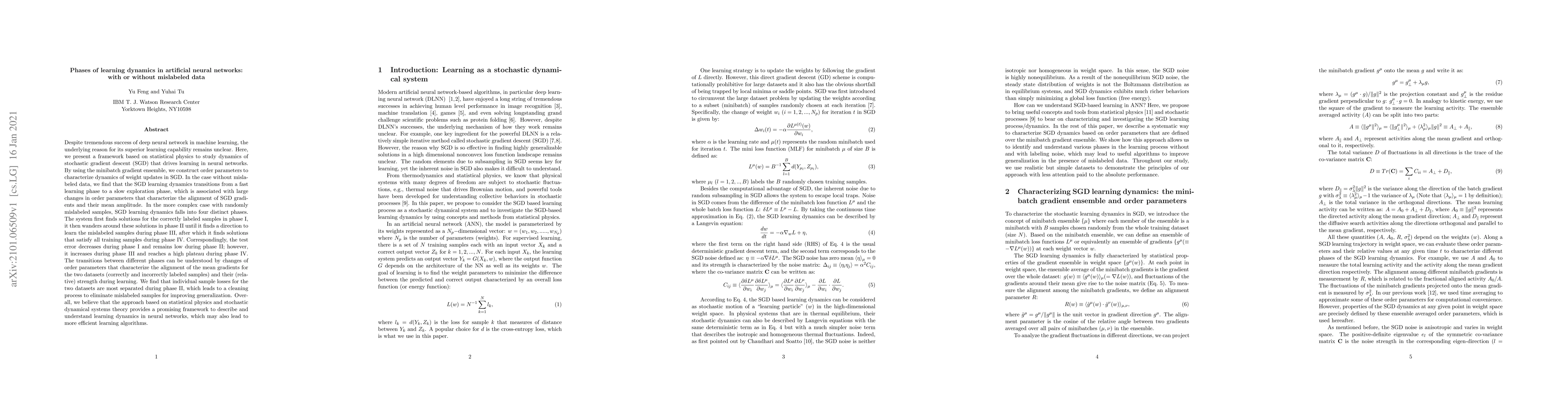 Despite tremendous success of deep neural network in machine learning, the underlying reason for its superior learning capability remains unclear. Here, we present a framework based on statistical physics to study dynamics of stochastic gradient descent (SGD) that drives learning in neural networks. By using the minibatch gradient ensemble, we construct order parameters to characterize dynamics of weight updates in SGD. Without mislabeled data, we find that the SGD learning dynamics transitions from a fast learning phase to a slow exploration phase, which is associated with large changes in order parameters that characterize the alignment of SGD gradients and their mean amplitude. In the case with randomly mislabeled samples, SGD learning dynamics falls into four distinct phases. The system first finds solutions for the correctly labeled samples in phase I, it then wanders around these solutions in phase II until it finds a direction to learn the mislabeled samples during phase III, after which it finds solutions that satisfy all training samples during phase IV. Correspondingly, the test error decreases during phase I and remains low during phase II; however, it increases during phase III and reaches a high plateau during phase IV. The transitions between different phases can be understood by changes of order parameters that characterize the alignment of mean gradients for the correctly and incorrectly labeled samples and their (relative) strength during learning. We find that individual sample losses for the two datasets are most separated during phase II, which leads to a cleaning process to eliminate mislabeled samples for improving generalization.