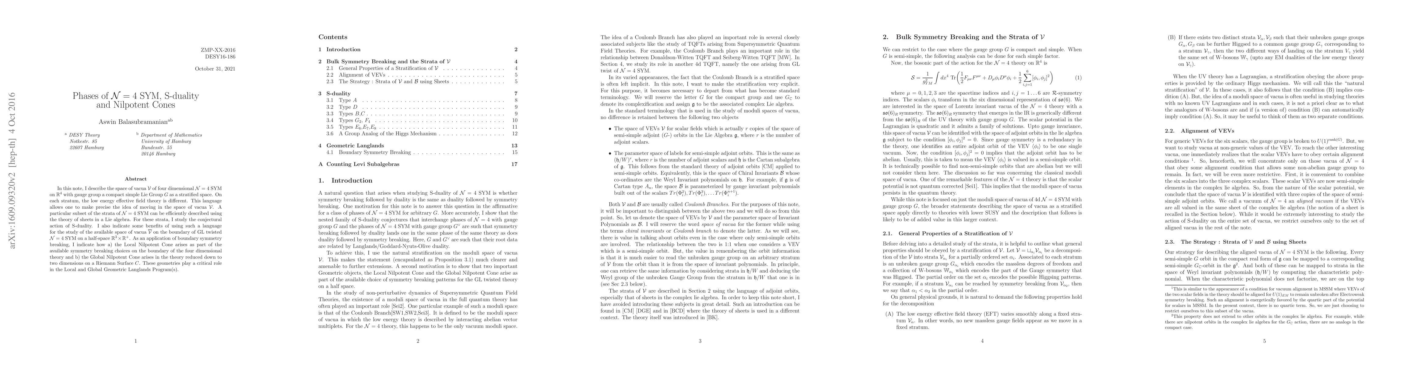 In this note, I describe the space of vacua $\mathcal{V}$ of four dimensional $\mathcal{N}=4$ SYM on $\mathbb{R}^4$ with gauge group a compact simple Lie Group $G$ as a stratified space. On each stratum, the low energy effective field theory is different. This language allows one to make precise the idea of moving in the space of vacua $\mathcal{V}$. A particular subset of the strata of $\mathcal{N}=4$ SYM can be efficiently described using the theory of sheets in a Lie algebra. For these strata, I study the conjectural action of S-duality. I also indicate some benefits of using such a language for the study of the available space of vacua $\overline{\mathcal{V}}$ on the boundary of GL twisted $\mathcal{N}=4$ SYM on a half-space $\mathbb{R}^3 \times \mathbb{R}^+$. As an application of boundary symmetry breaking, I indicate how a) the Local Nilpotent Cone arises as part of the available symmetry breaking choices on the boundary of the four dimensional theory and b) the Global Nilpotent Cone arises in the theory reduced down to two dimensions on a Riemann Surface $C$. These geometries play a critical role in the Local and Global Geometric Langlands Program(s).